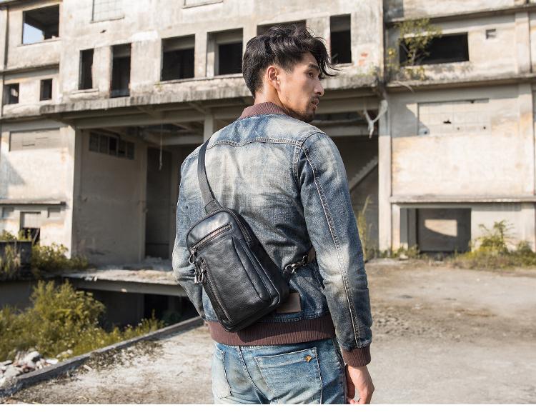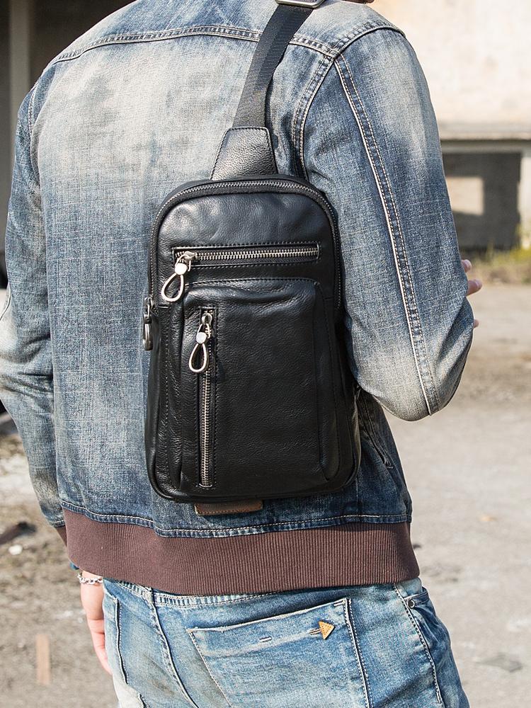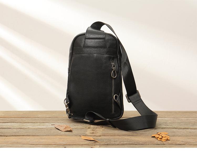 Style: Black Casual Leather Mens 8 inches Sling Bag Chest Bag Black One Shoulder Backpack Phone Bag for Men