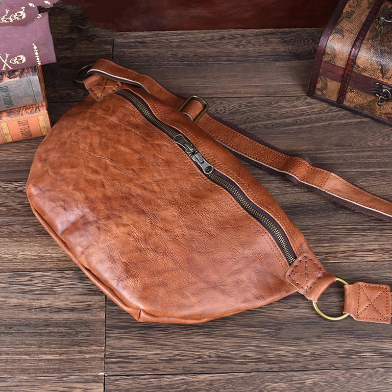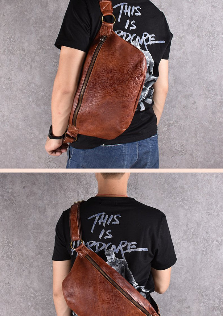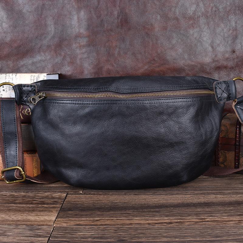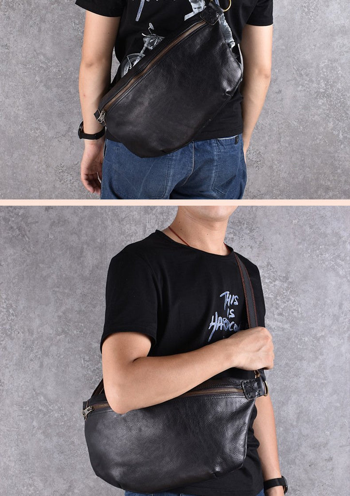 Style: Black Leather Mens Large Sling Bag Leather Sling Pack Postman Bag Fanny Pack Shoulder Bag For Men