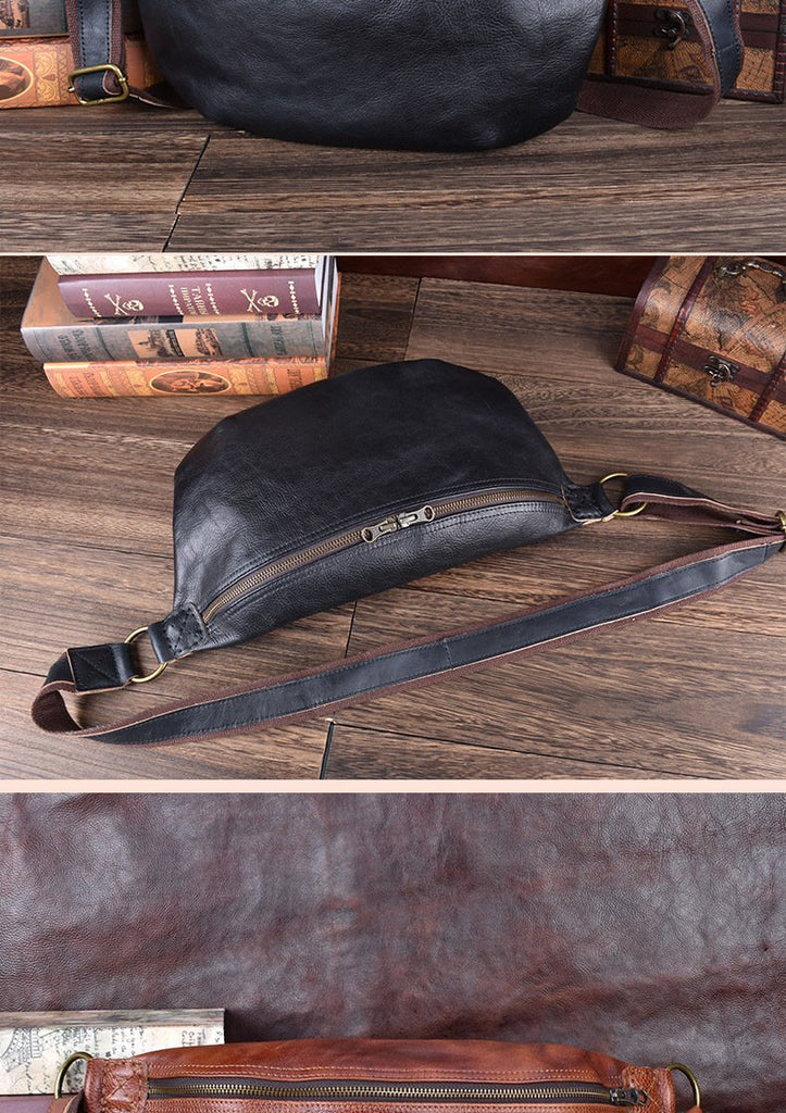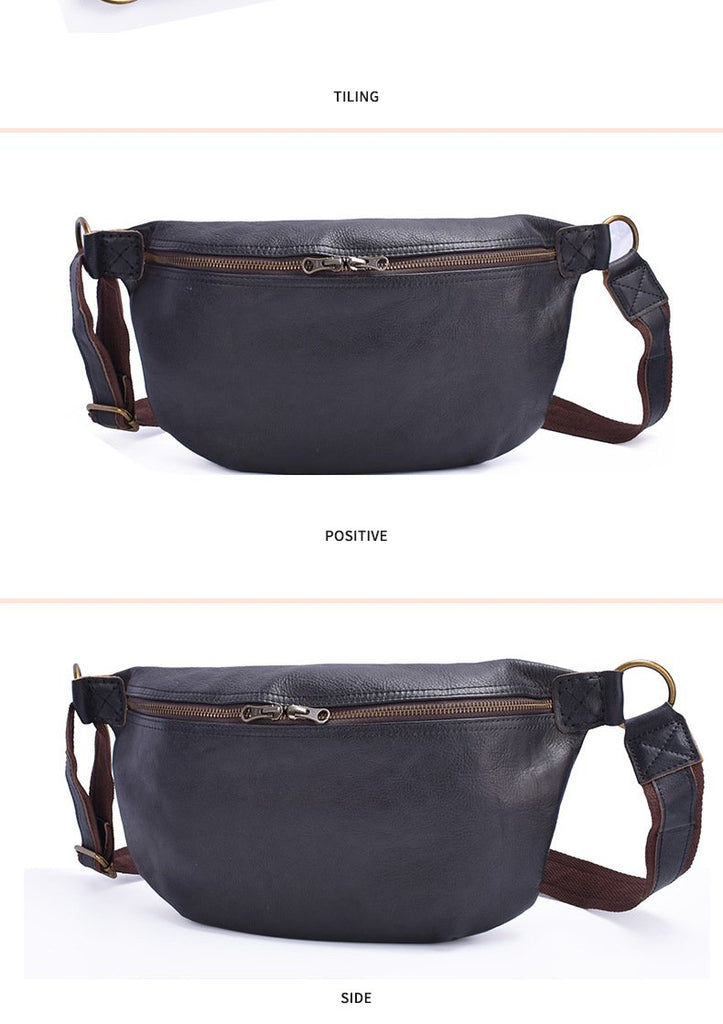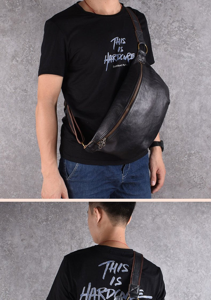 Design: Black Leather Mens Large Sling Bag Leather Sling Pack Postman Bag Fanny Pack Shoulder Bag For Men
