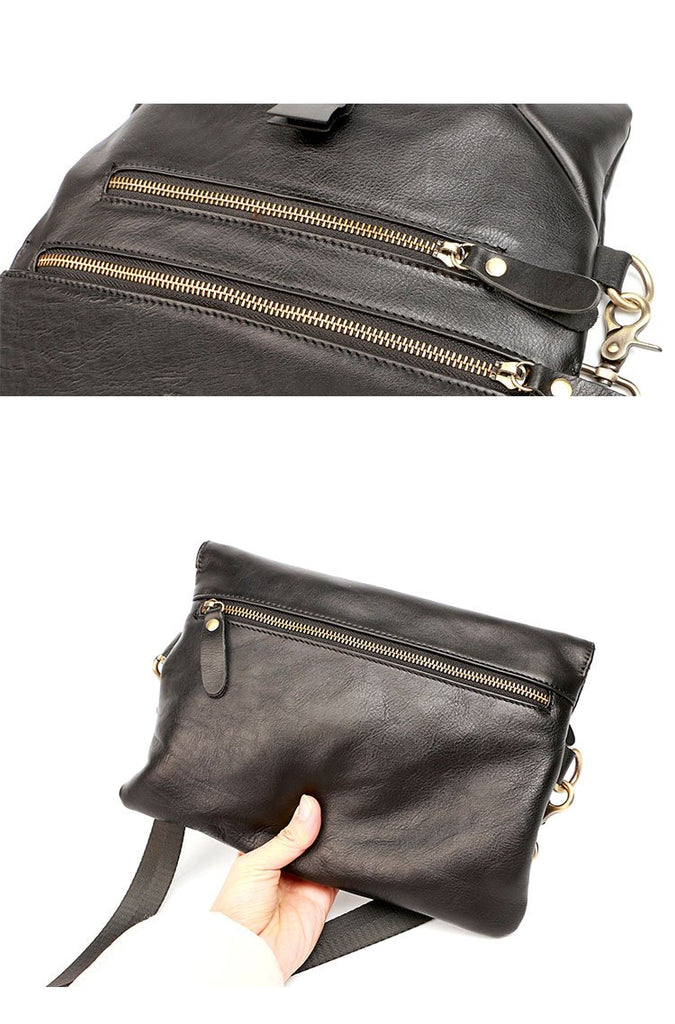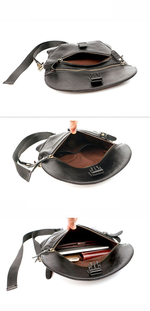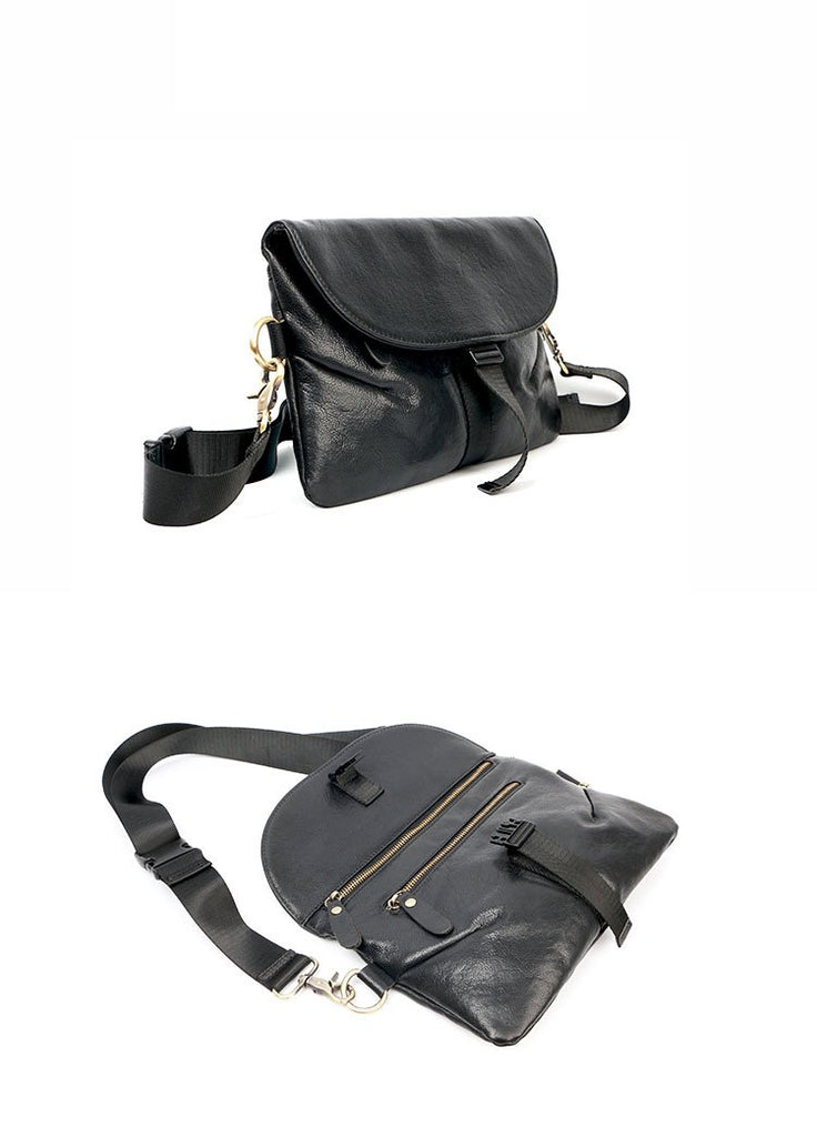 Design: Black Leather Mens 8 inches Chest Bag Messenger Bag One Shoulder Bag For Men