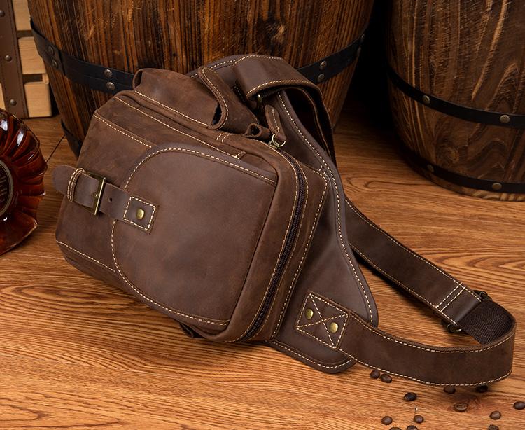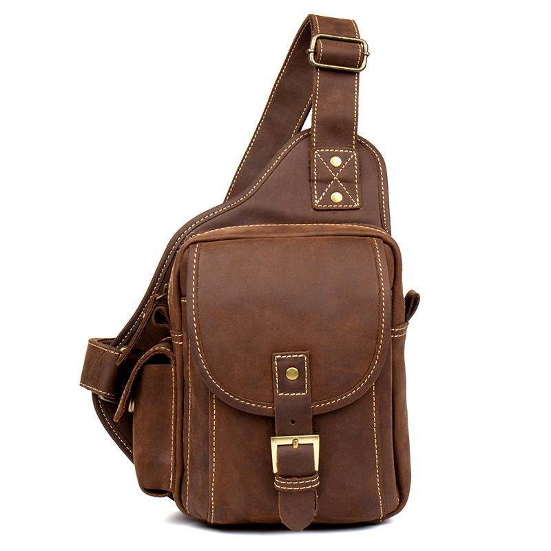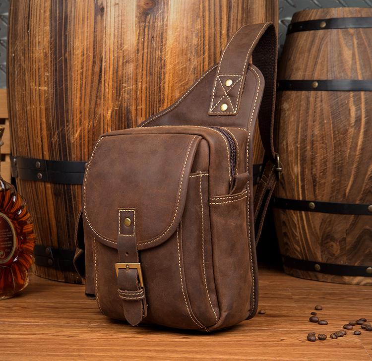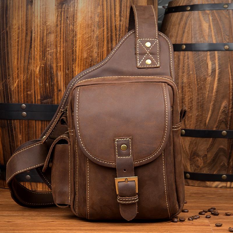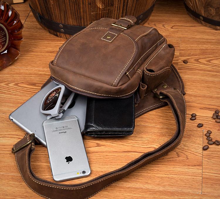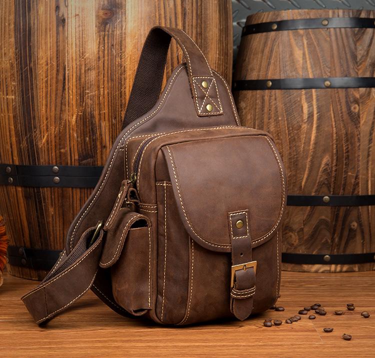 Design: Brown Casual Leather Mens 8 inches Sling Bags Chest Bag One Shoulder Backpack for Men