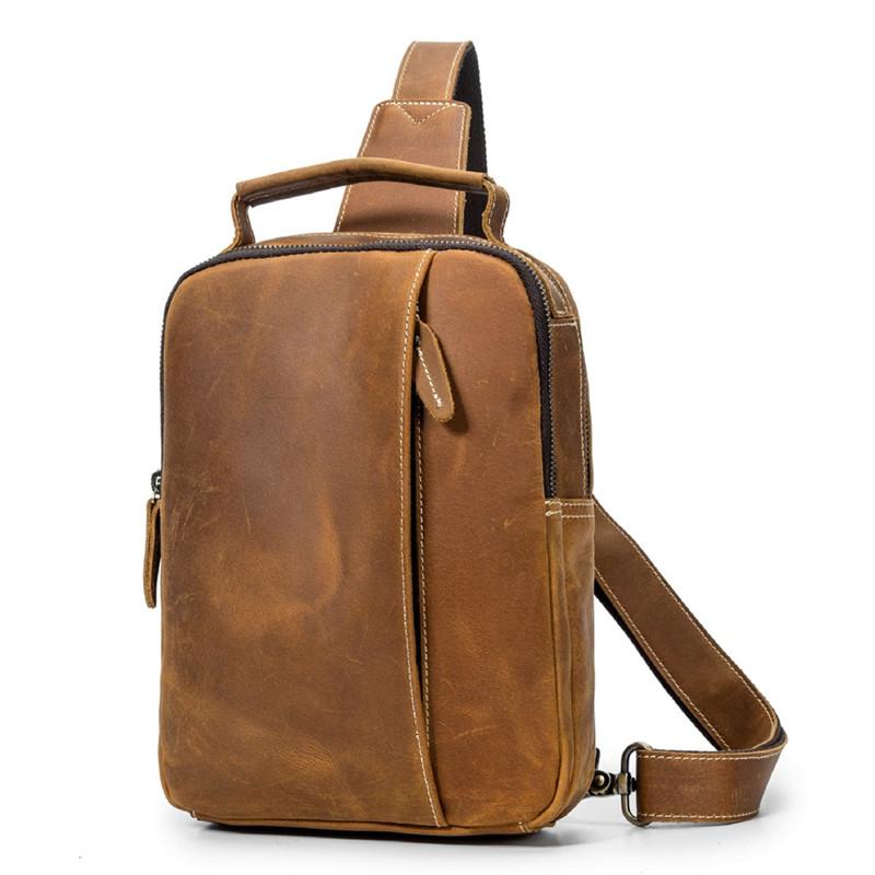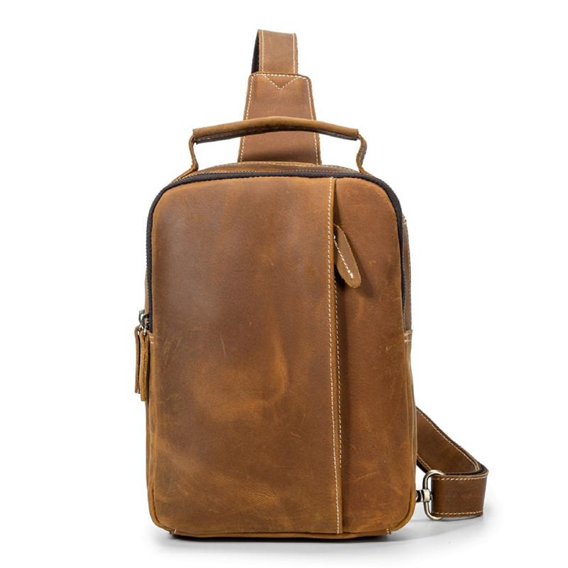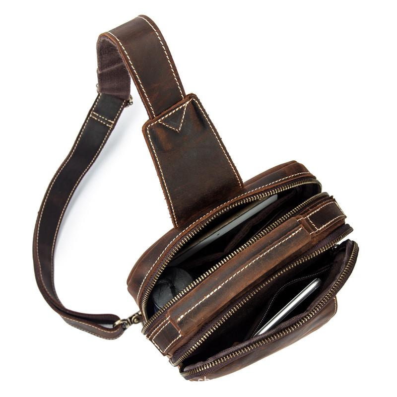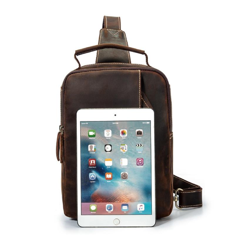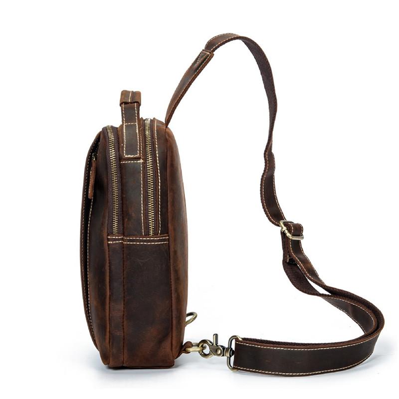Design: Brown Cool Distressed LEATHER MENS 8 inches Sling Bag One Shoulder Backpack Dark Brown Chest Bag For Men
