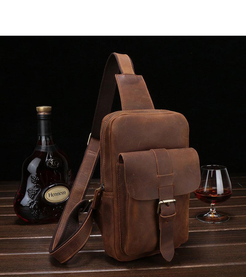 Style: Brown Cool LEATHER MENS 8 inches Sling Bags One Shoulder Backpack Dark Brown Chest Bag For Men