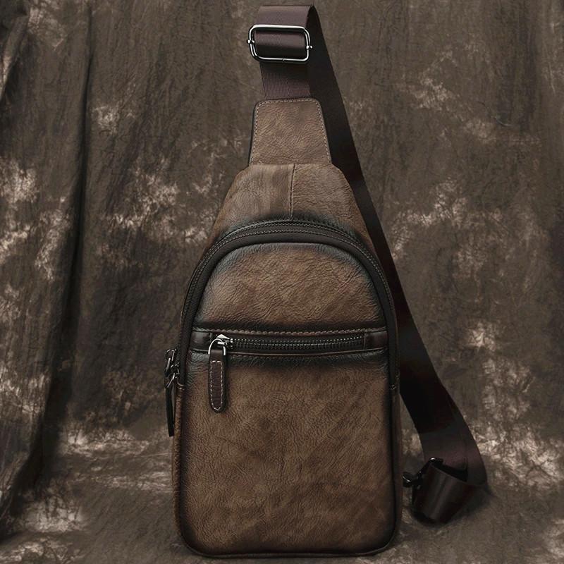 Design: Brown Cool LEATHER MENS Sling Bag Chest Bag Khaki One Shoulder Bag For Men