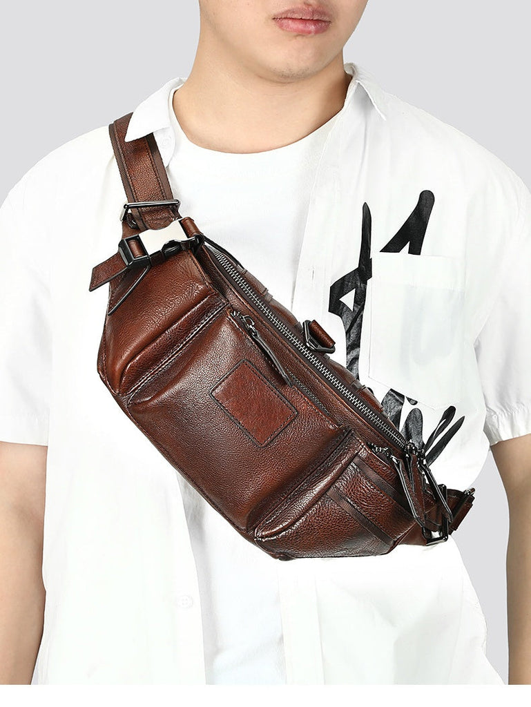 Design: Brown Leather Sling Bag Waist Bag for Men Mens Leather Sling Waist Bag