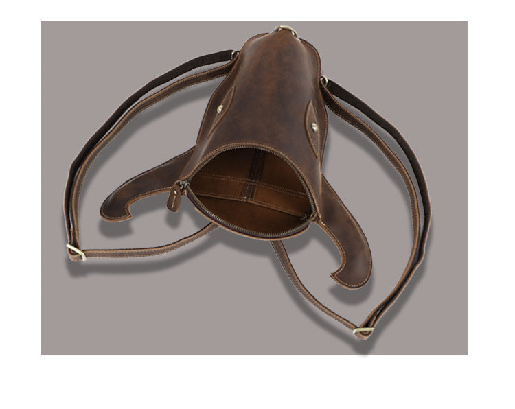 Introducing a bold statement piece that merges artistic design with functional style—our Leather Backpack for Men, a uniquely crafted accessory that commands attention. This standout Cool Backpack features a striking bull head silhouette, with the top zipper cleverly positioned as the "nose ring" of the bull, creating an unforgettable visual statement. Expertly constructed from premium full-grain crazy horse leather and available in two rugged tones—Coffee Brown and Classic Brown—this compact Bull Head Backpack measures 29cm x 9cm x 6cm, making it the perfect size for those who prefer a sleek, statement-making carry.