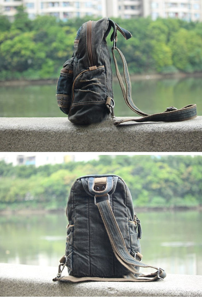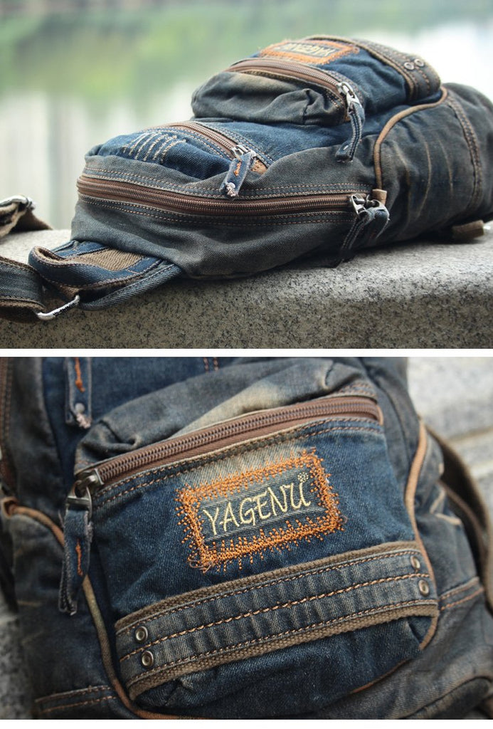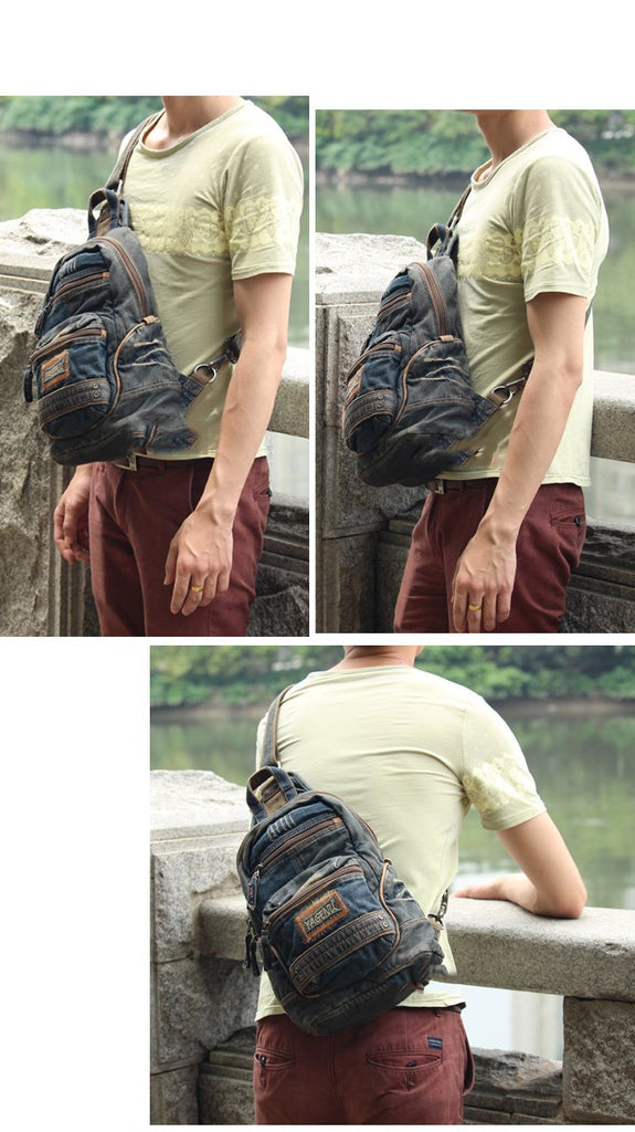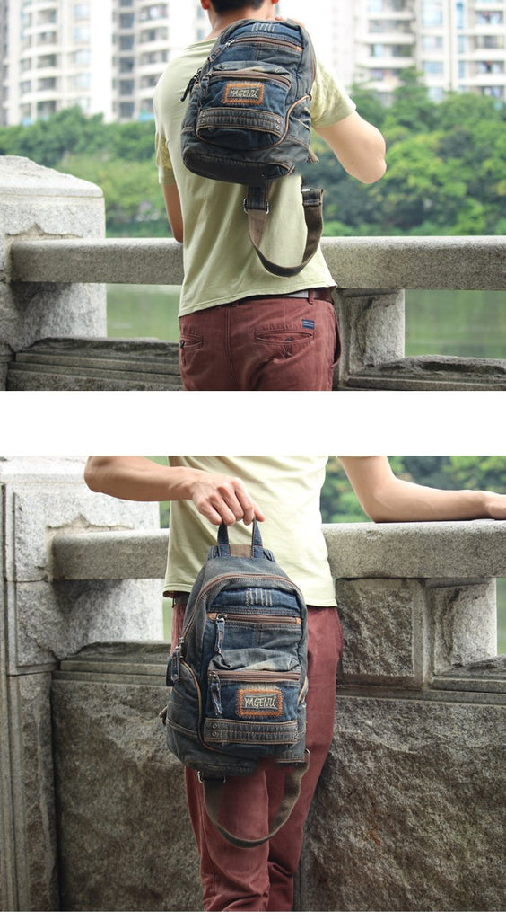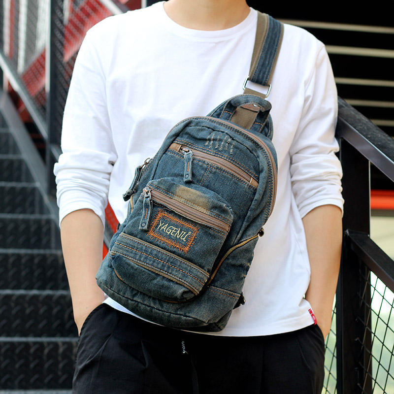 Style: Jean Vintage Blue Mens Large Sling Bag Chest Bag Jean One Shoulder Backpacks For Men