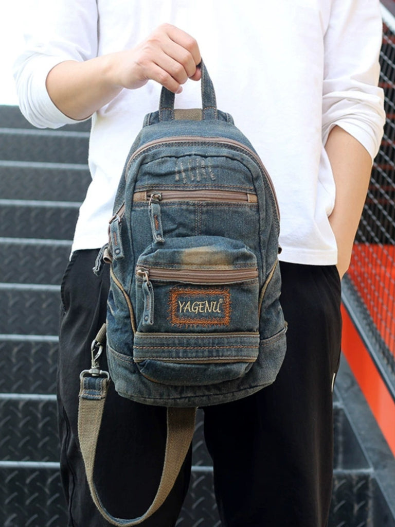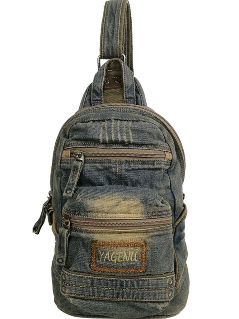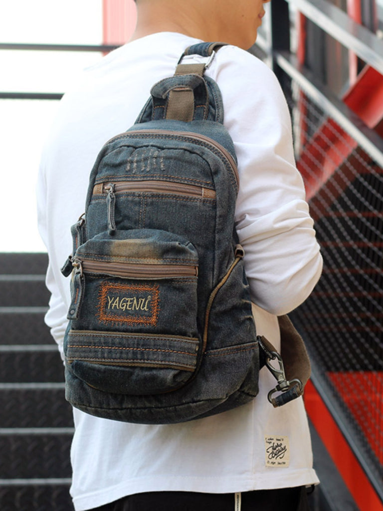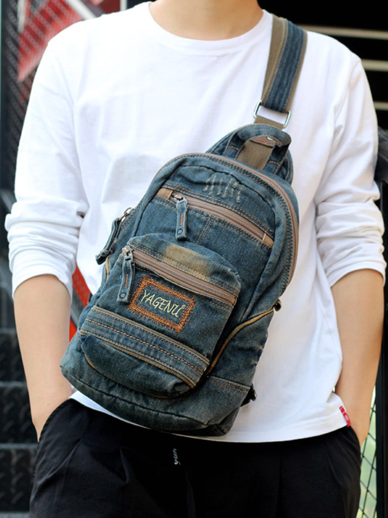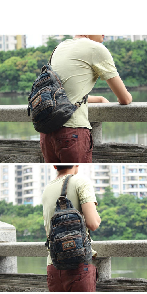 Design: Jean Vintage Blue Mens Large Sling Bag Chest Bag Jean One Shoulder Backpacks For Men