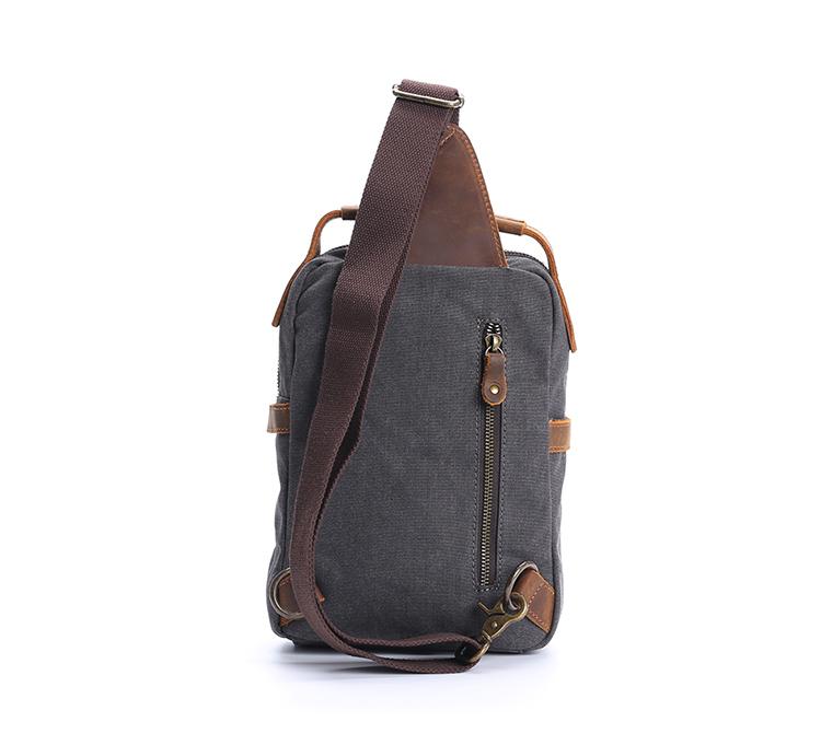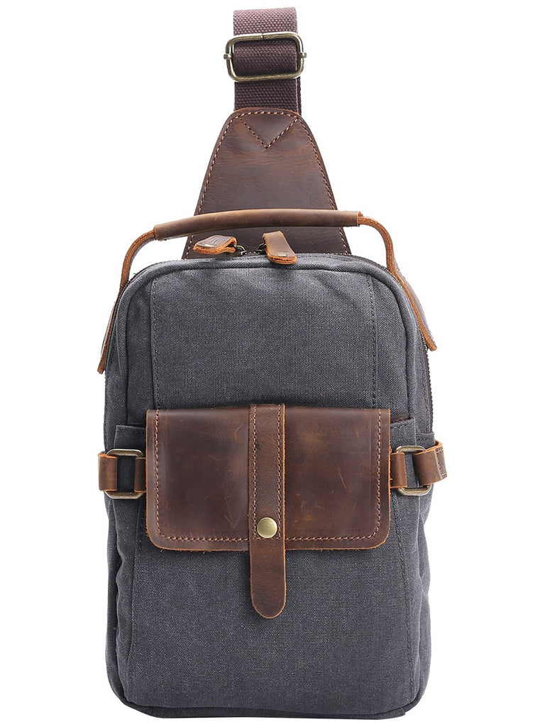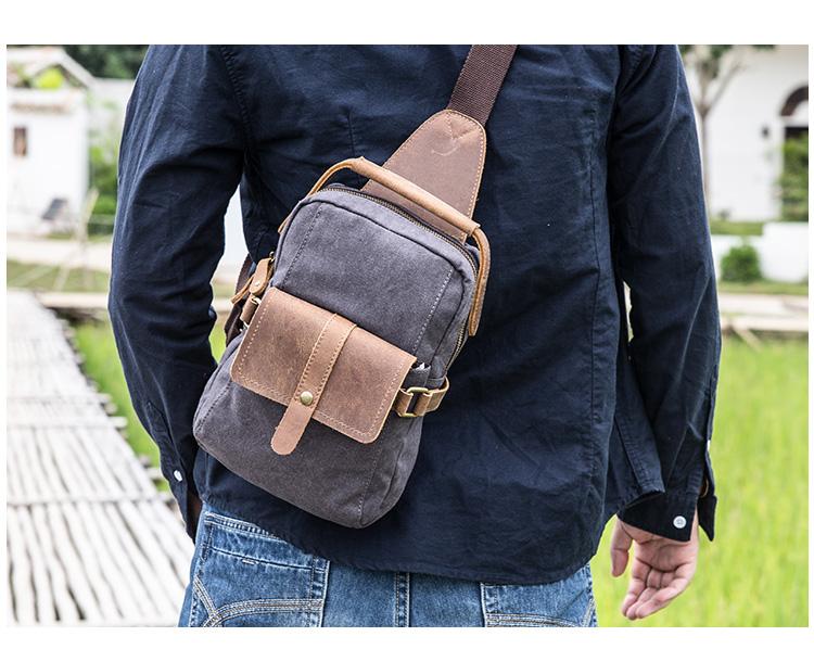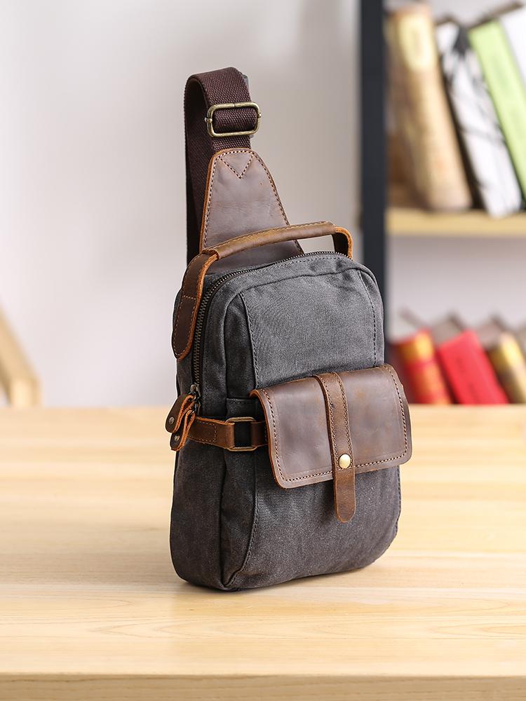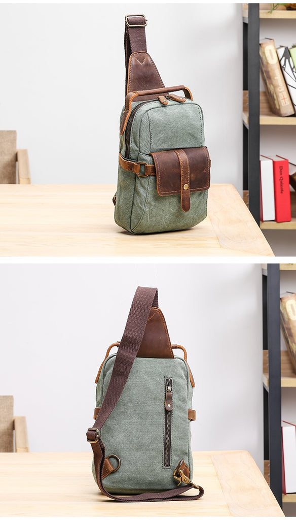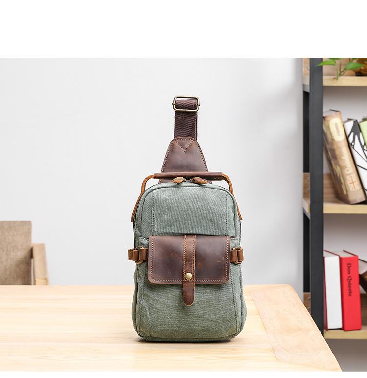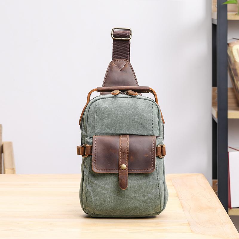 Design: Canvas Leather Mens Gray Chest Bag One Shoulder Backpack Green Sling Bag for Men