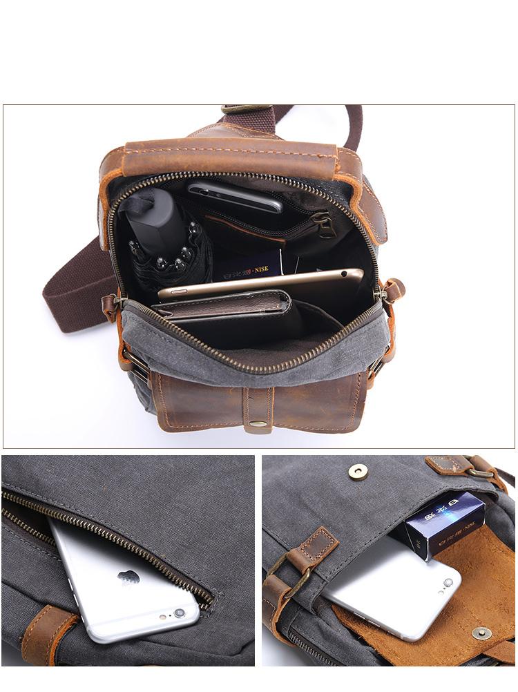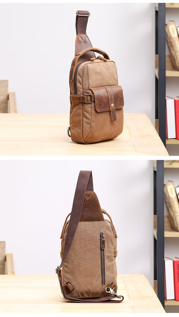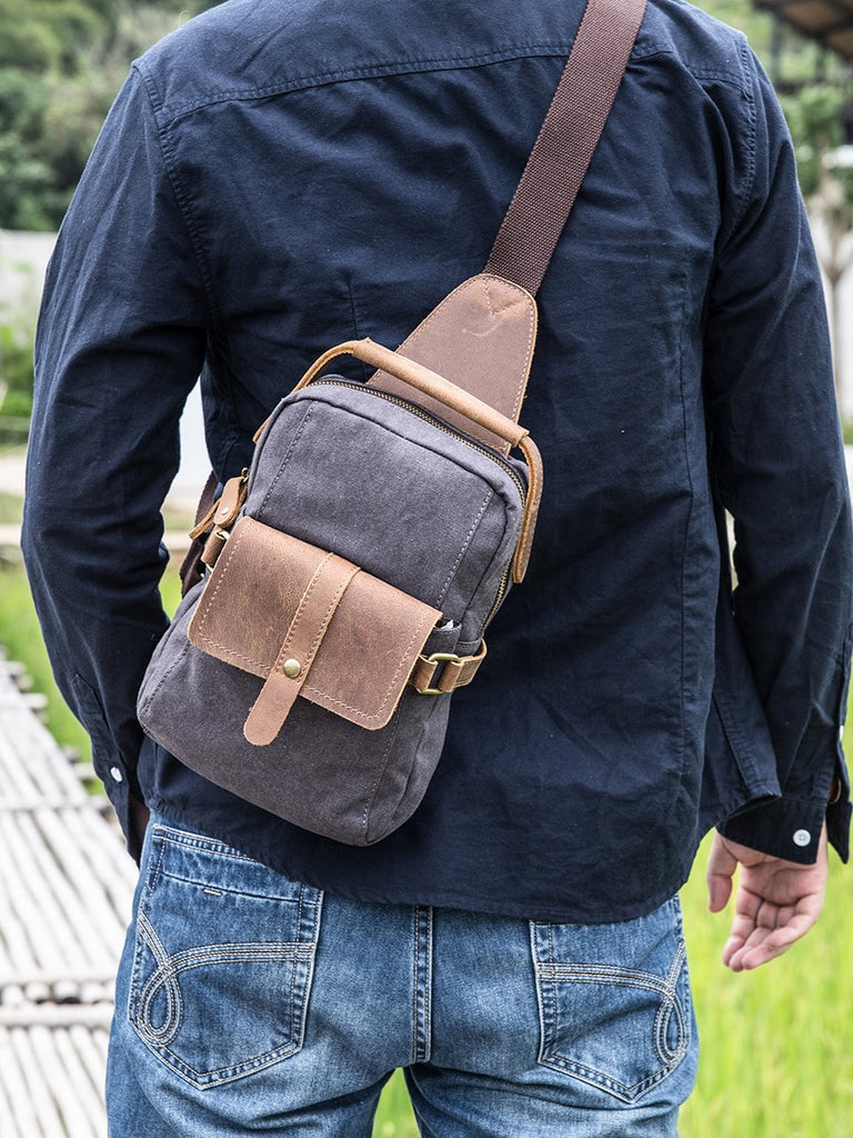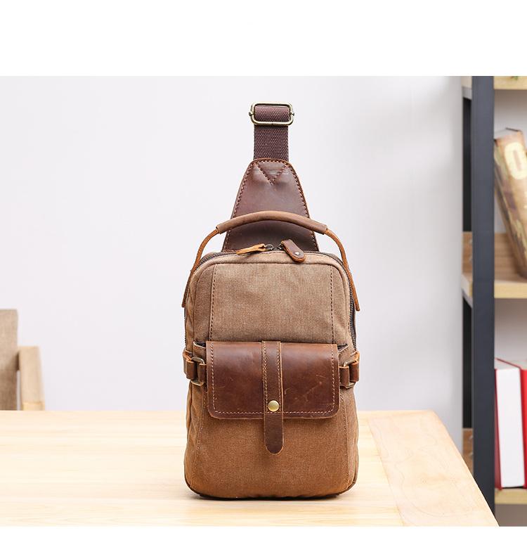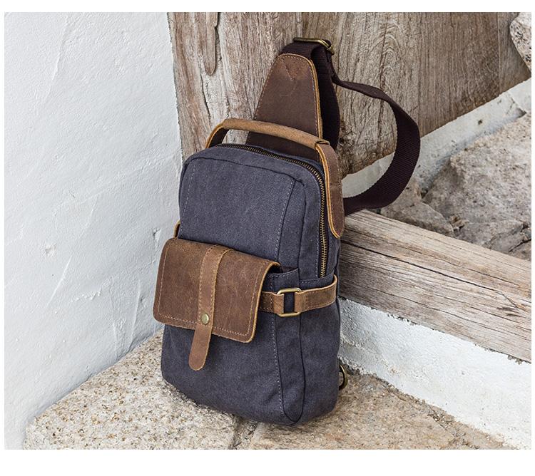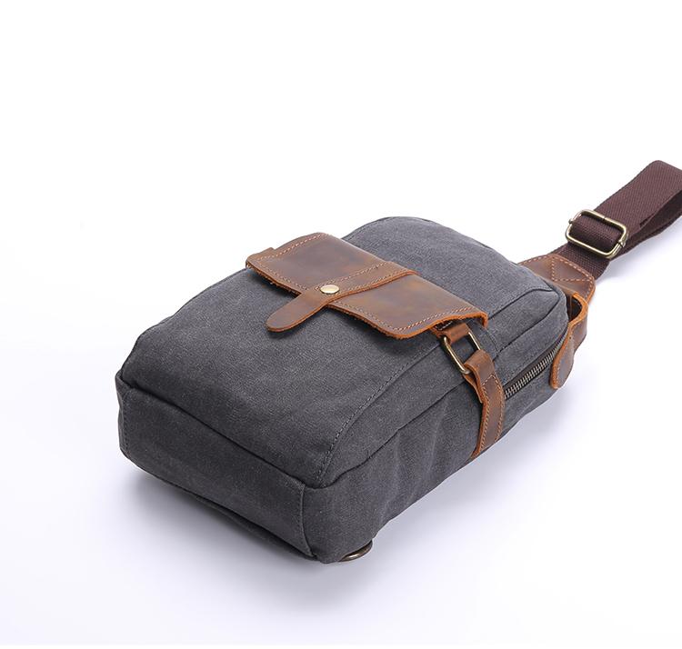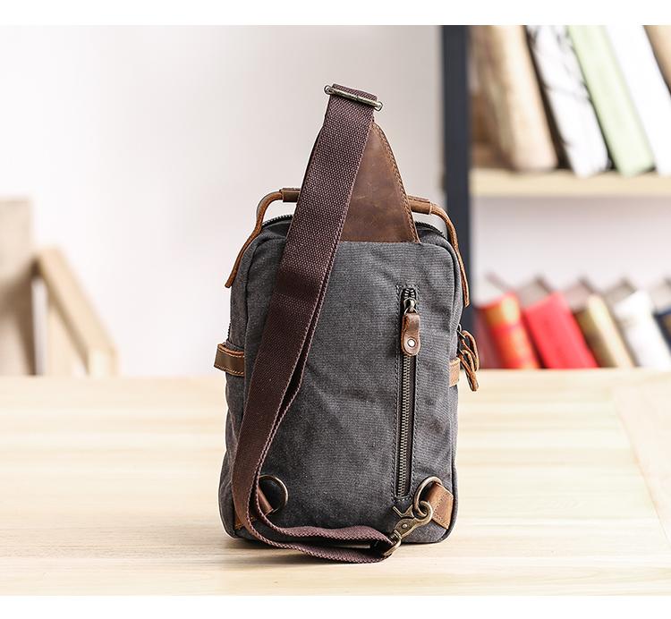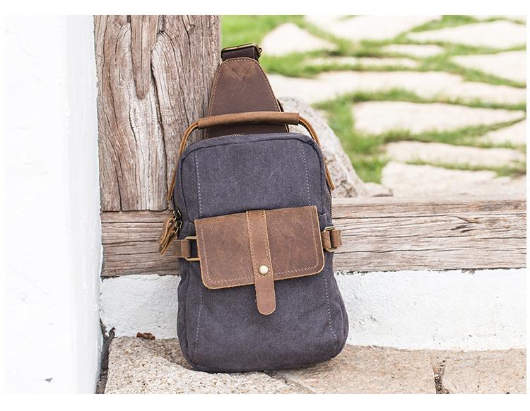 Design: Canvas Leather Mens Gray Chest Bag One Shoulder Backpack Green Sling Bag for Men