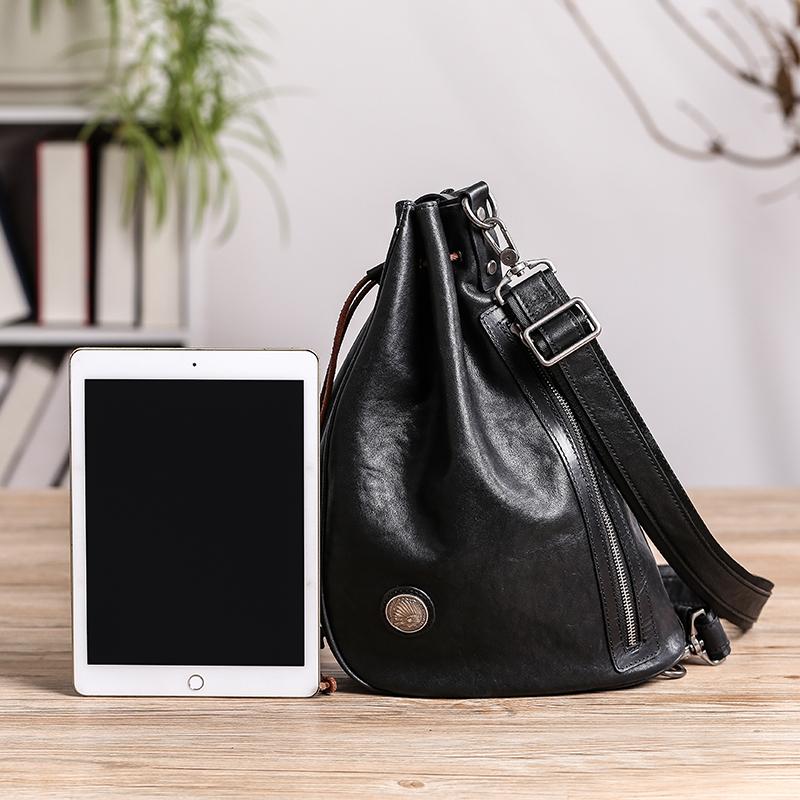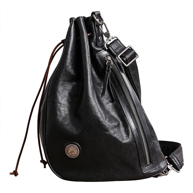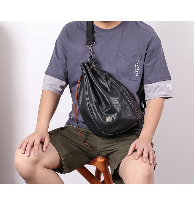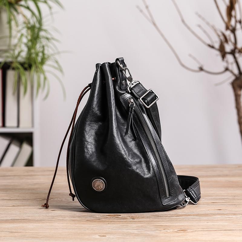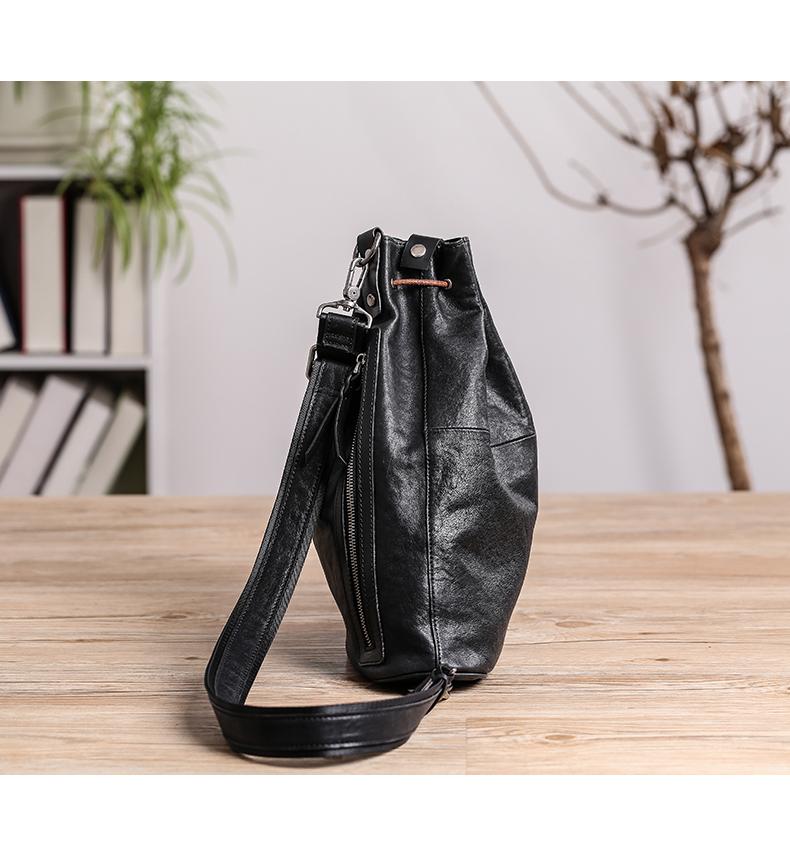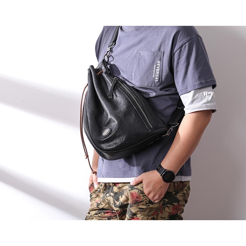 Design: Cool Black Leather Men's Bucket Bag Chest Bag One shoulder Backpack Crossbody Bag For Men