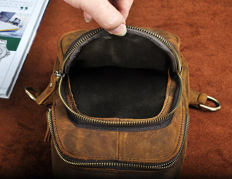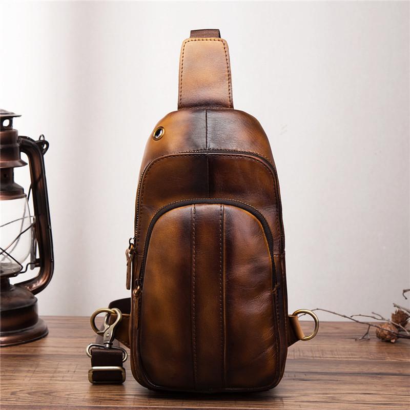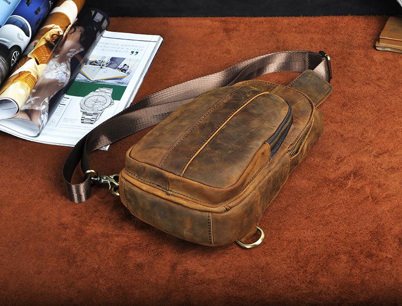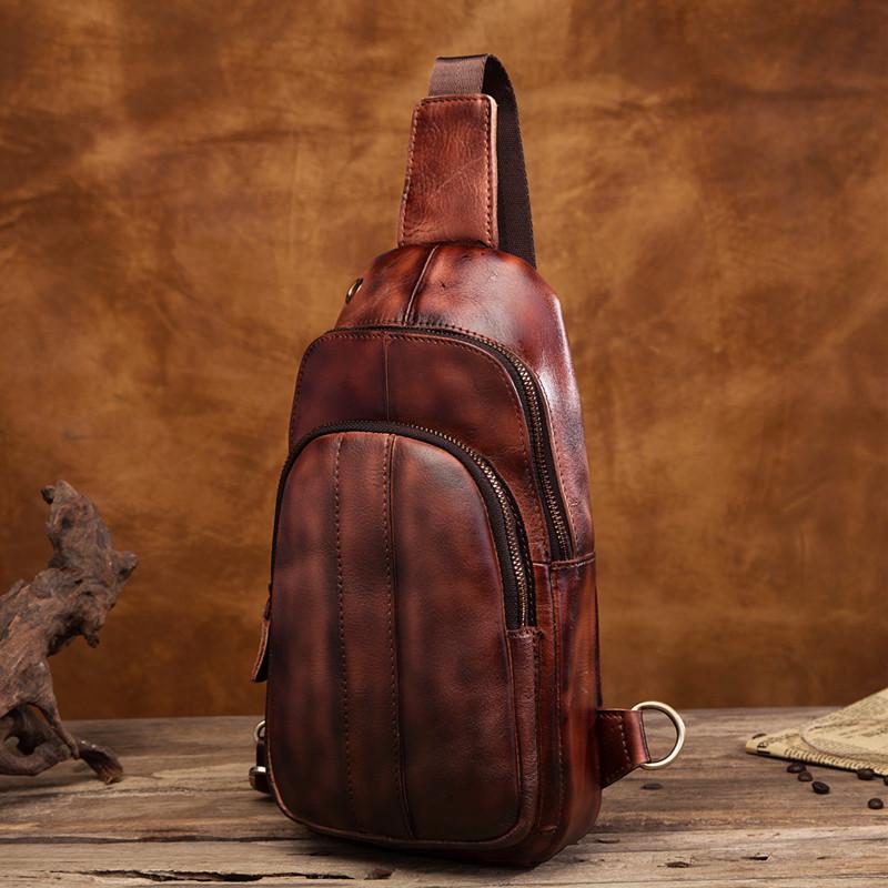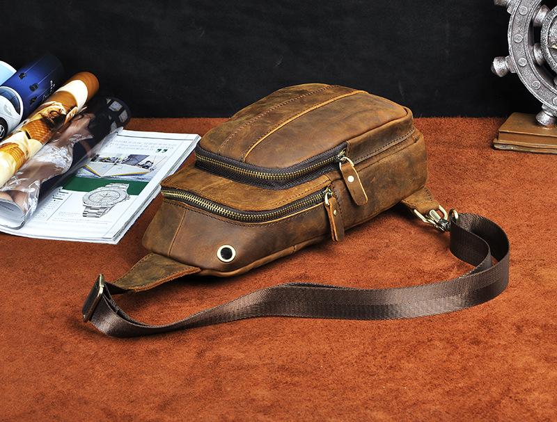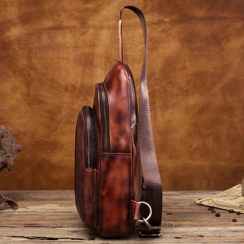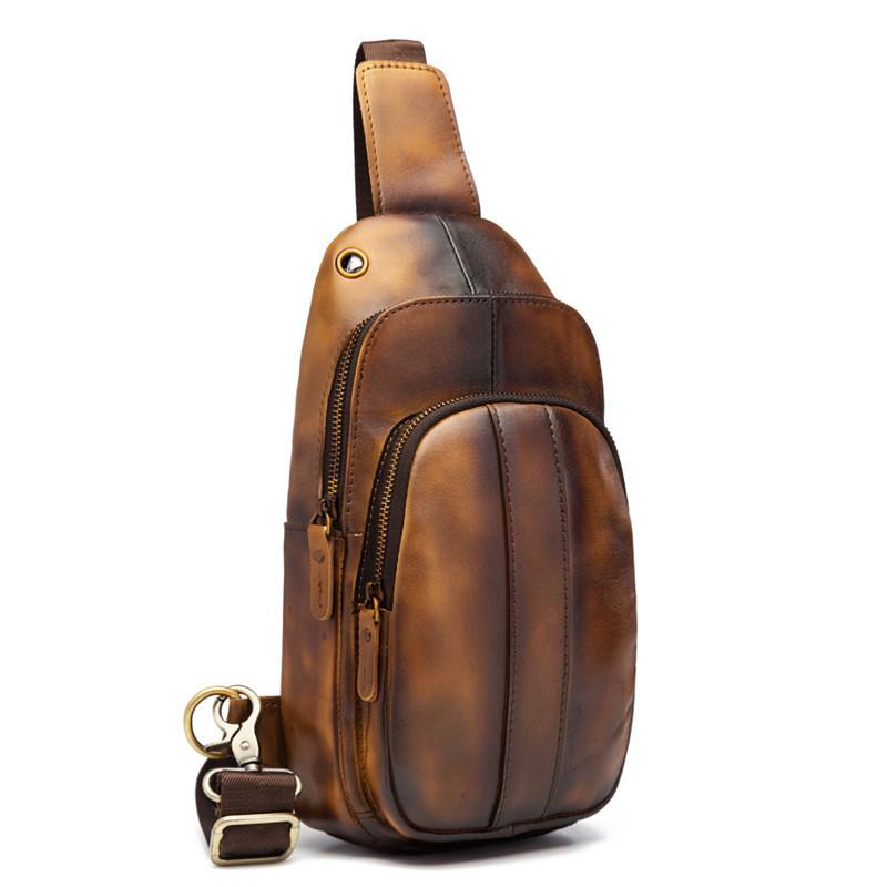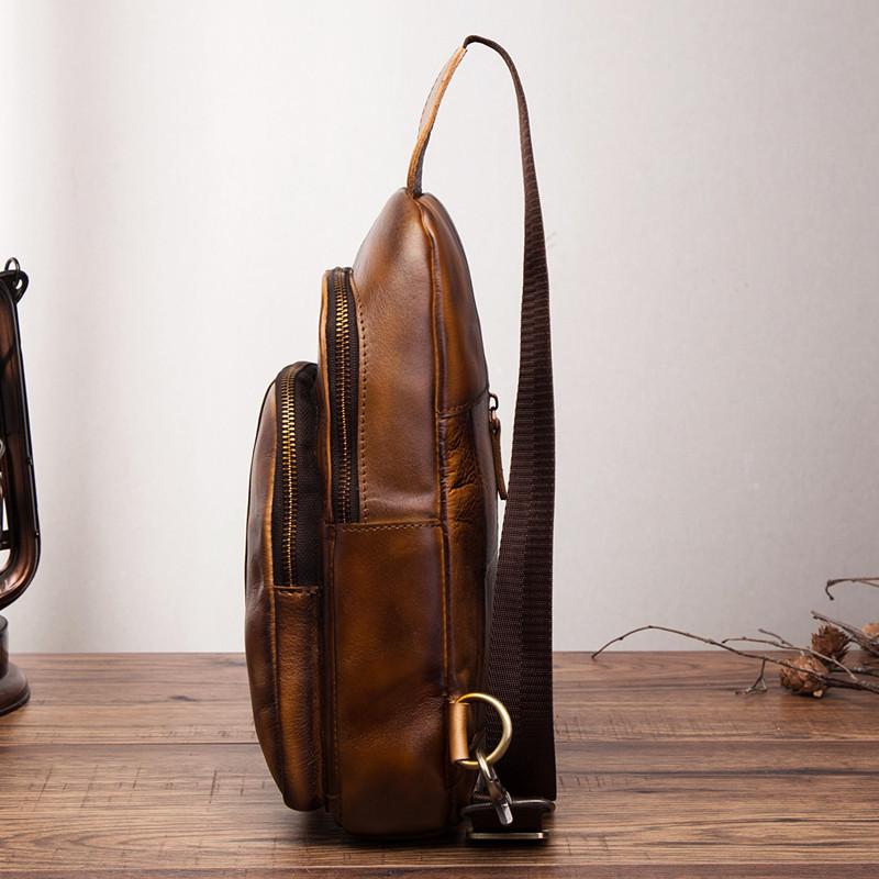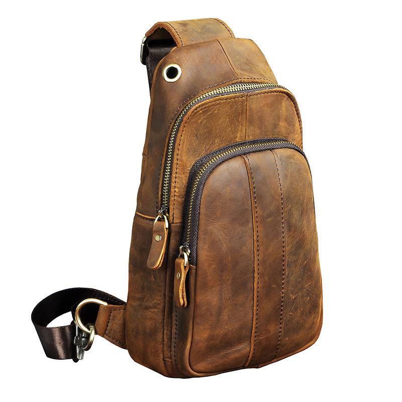 Style: Cool Brown Mens Leather One Shoulder Backpack Chest Bag Sling Bags For Men