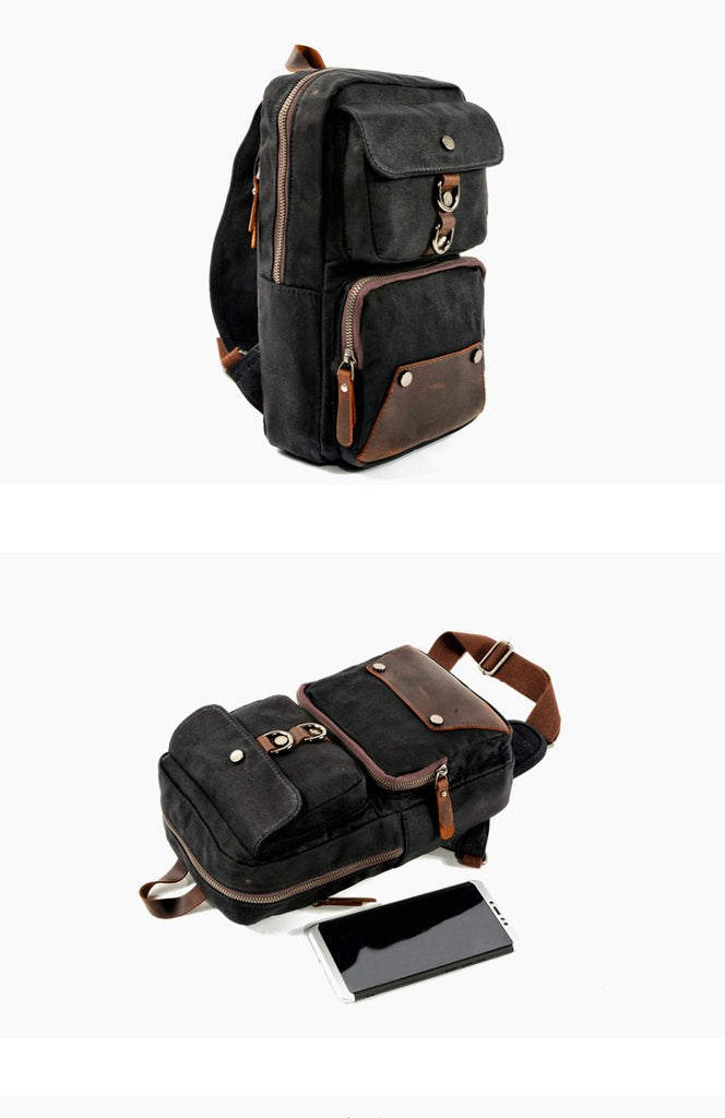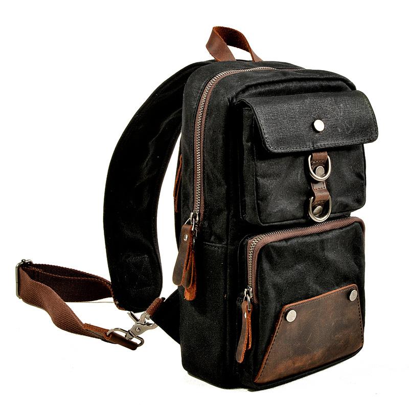Design: Cool Canvas Leather Mens Sling Bag Waterproof Chest Bag One Shoulder Backpack Phone Bag for Men