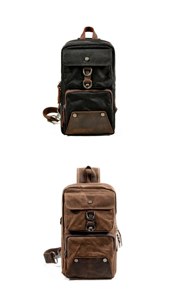 Style: Cool Canvas Leather Mens Sling Bag Waterproof Chest Bag One Shoulder Backpack Phone Bag for Men