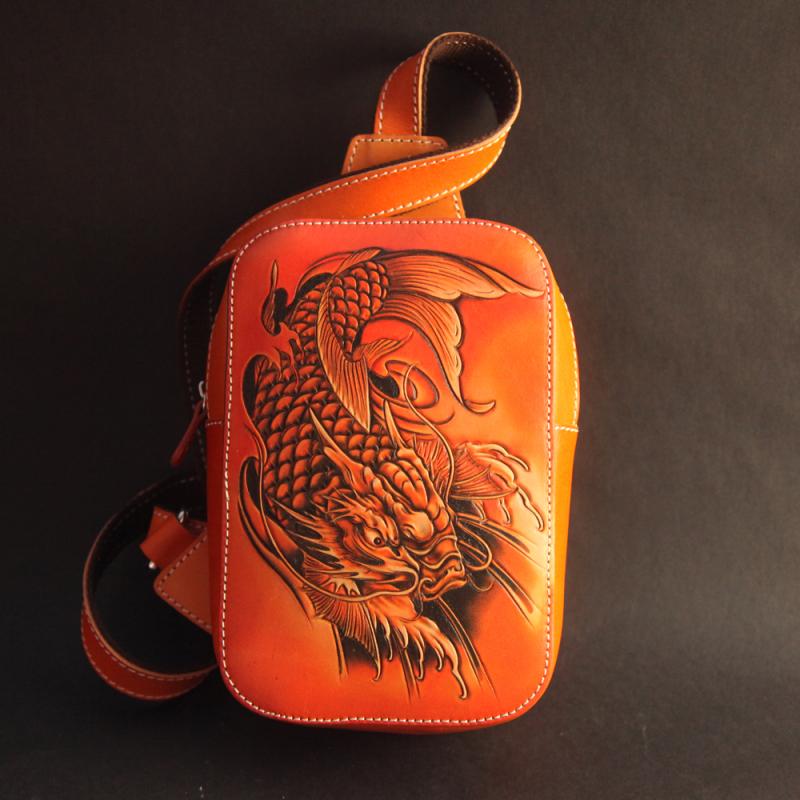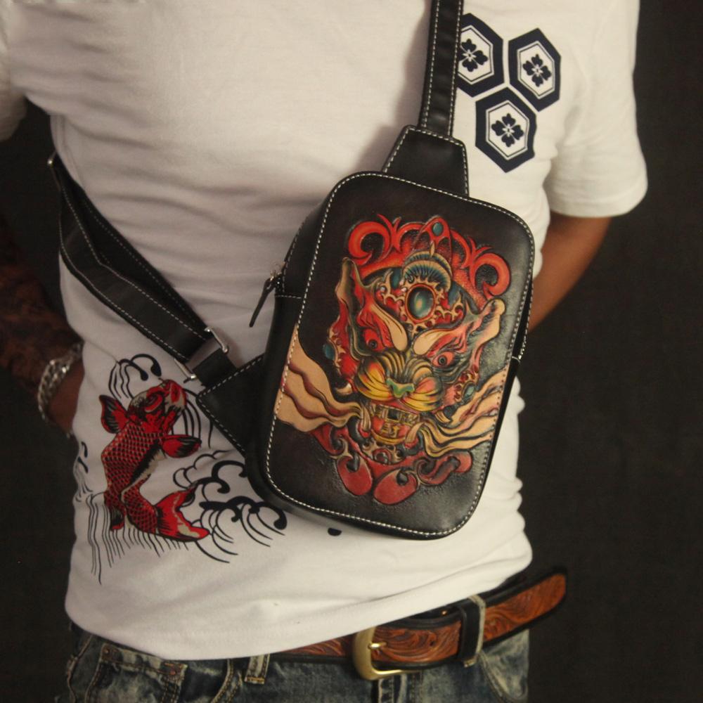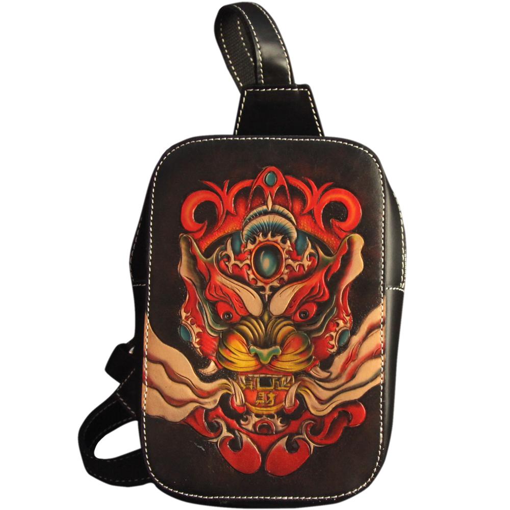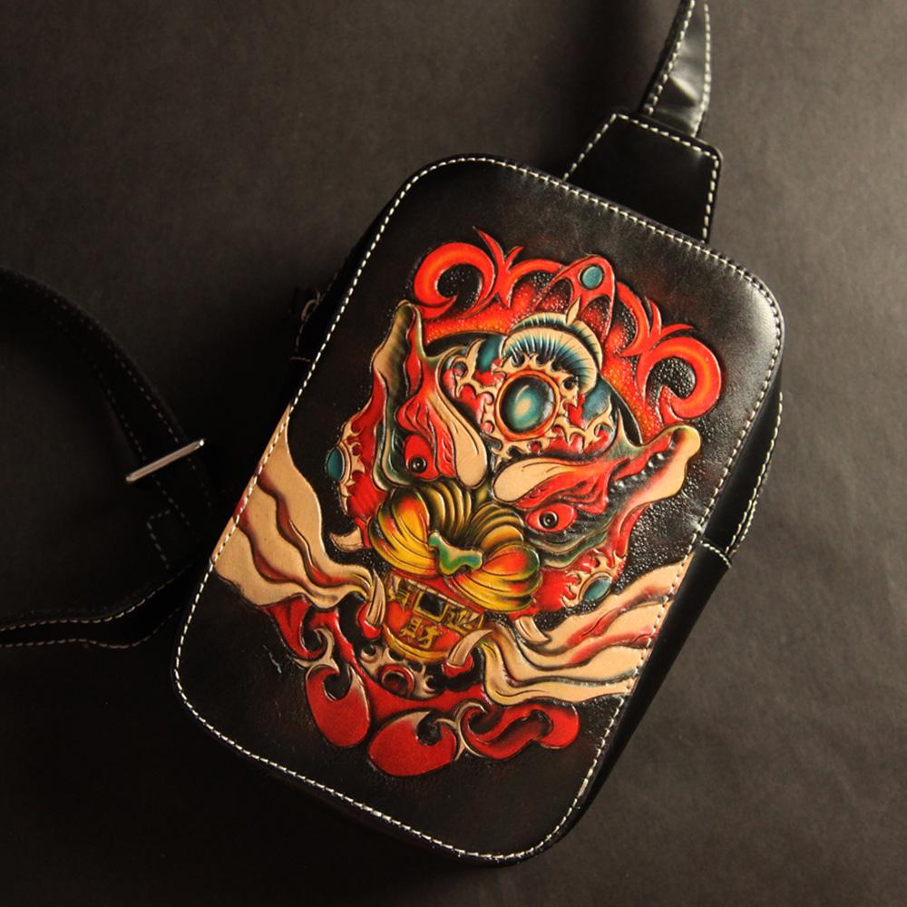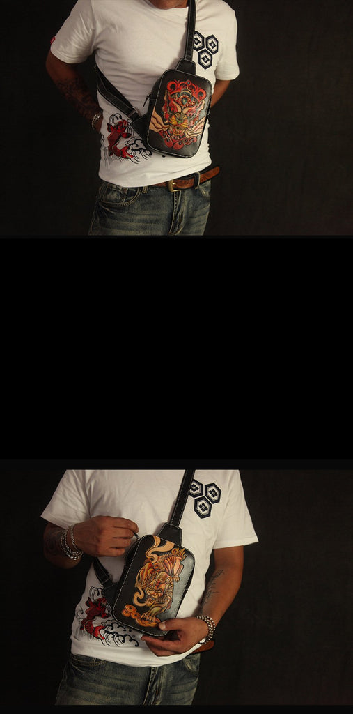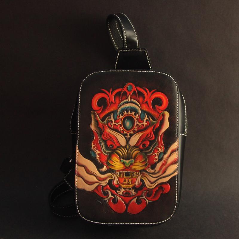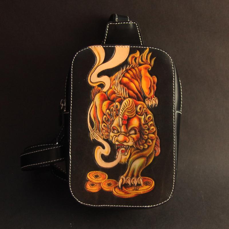 Cool Handmade Tooled Leather Tang Lion Sling Bag Chest Bag One Shoulder Backpack For Men