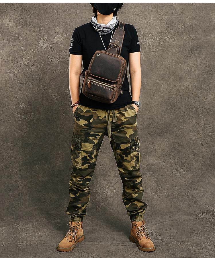 Style: Cool Leather Mens 10" Brown Chest Bag Dark Coffee Travel Backpack College Backpack for Men