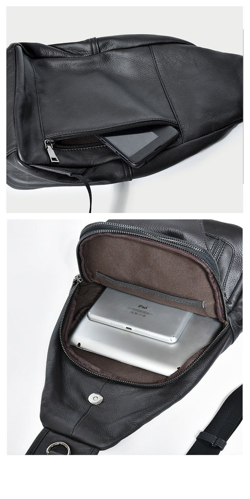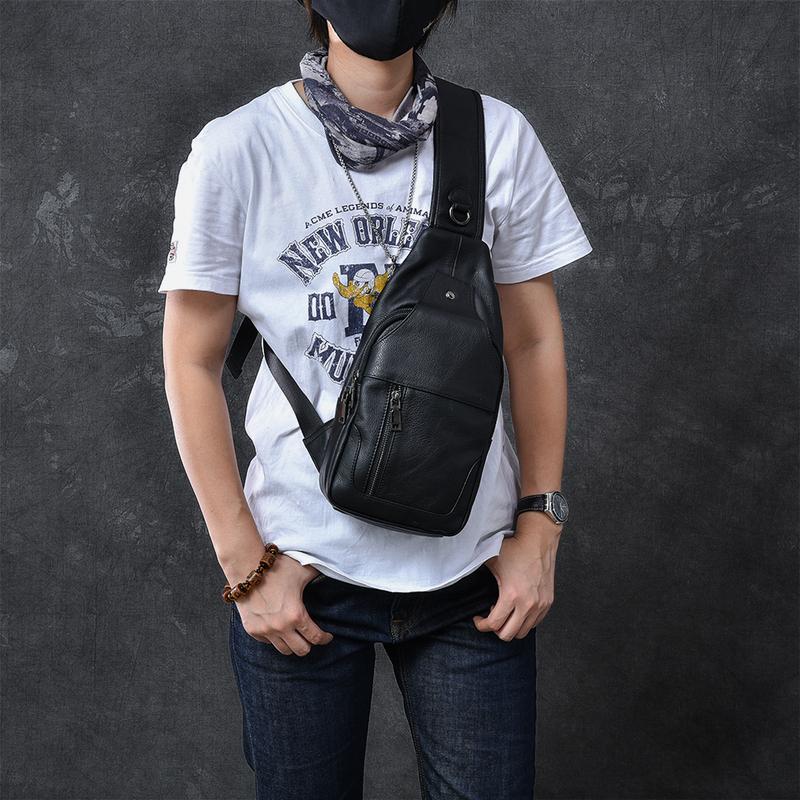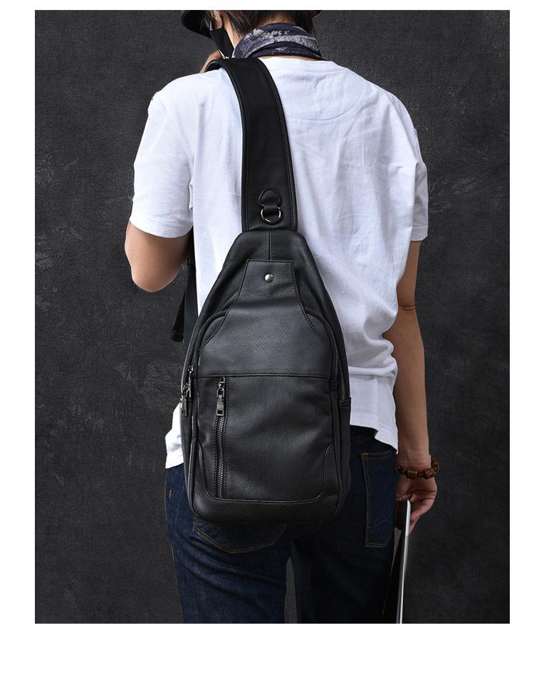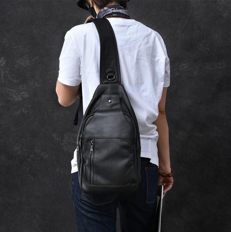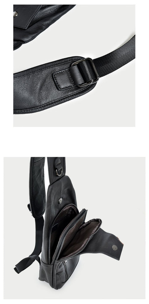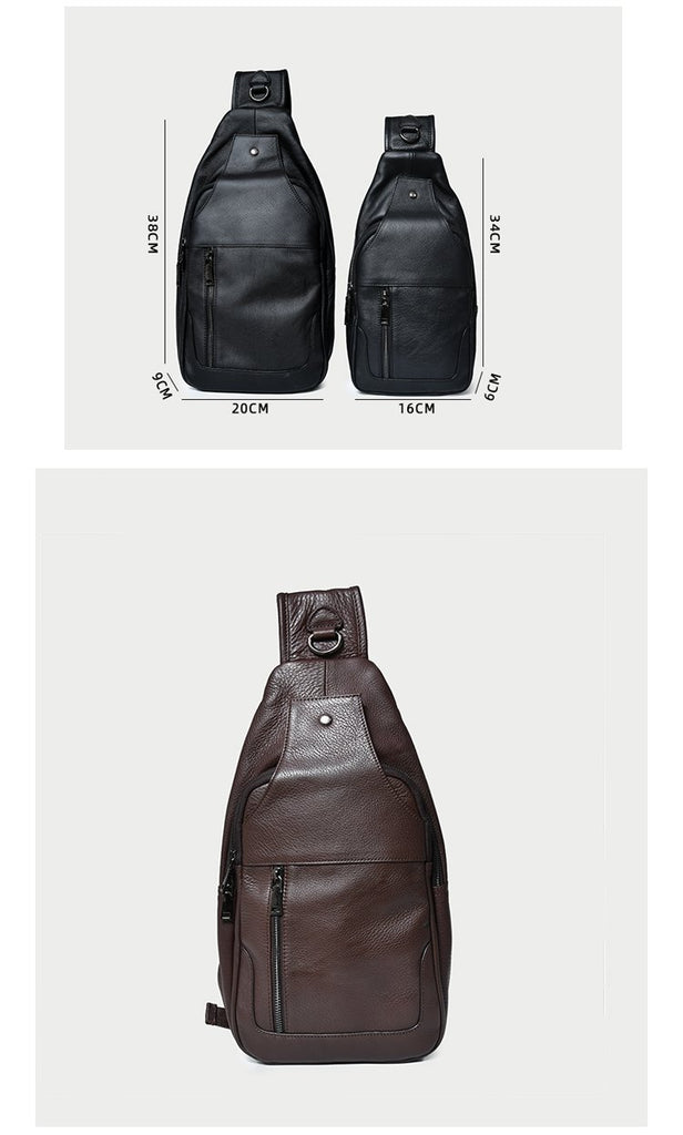 Design: Cool Leather Mens 10" Black Backpack Sling Bag Brown Chest Bag One Shoulder Backpack for Men