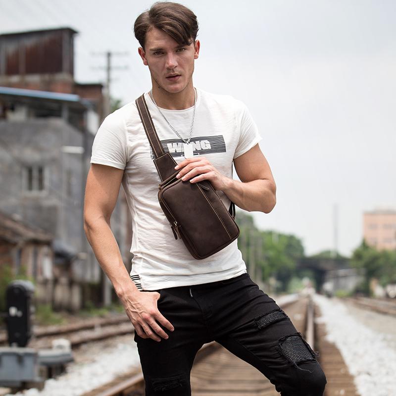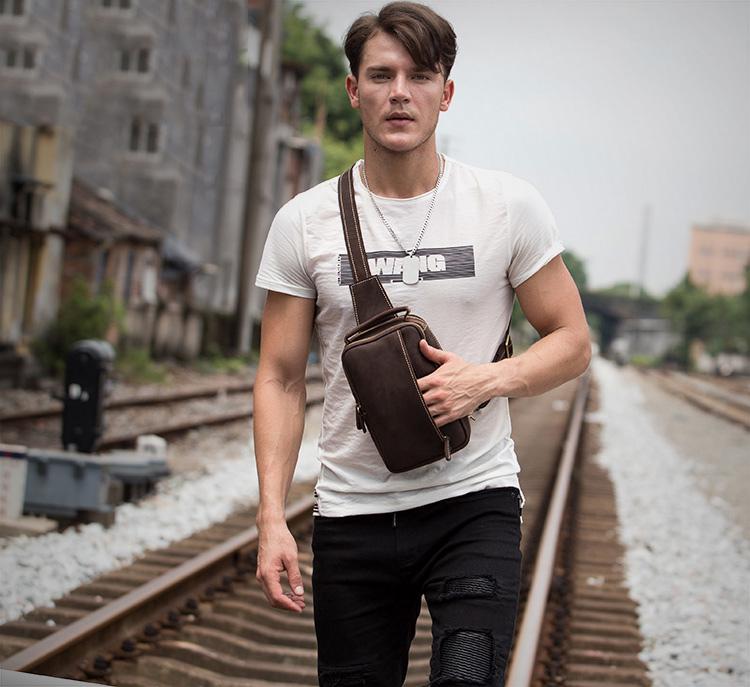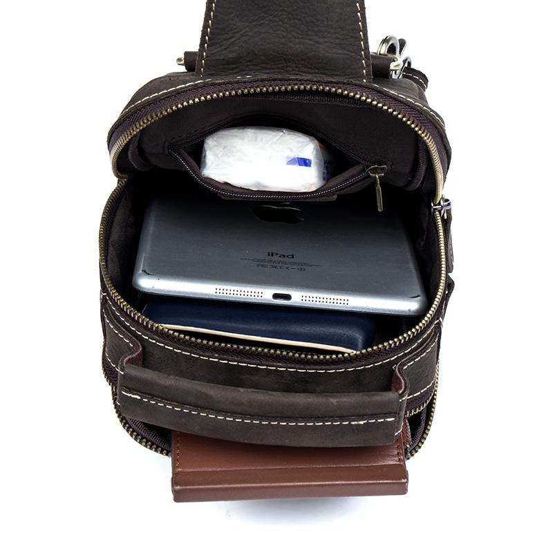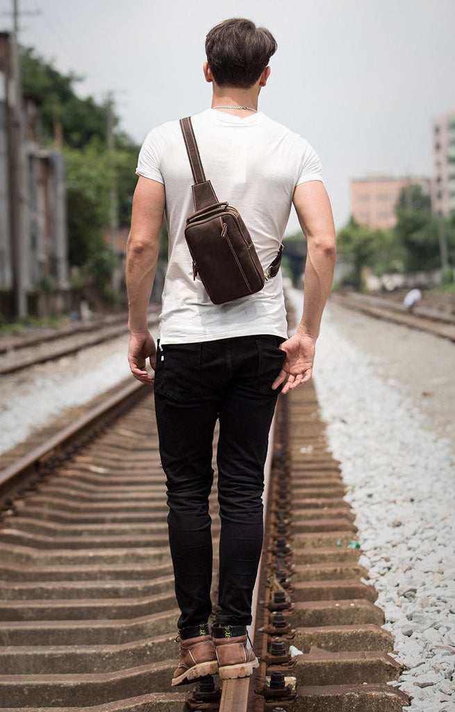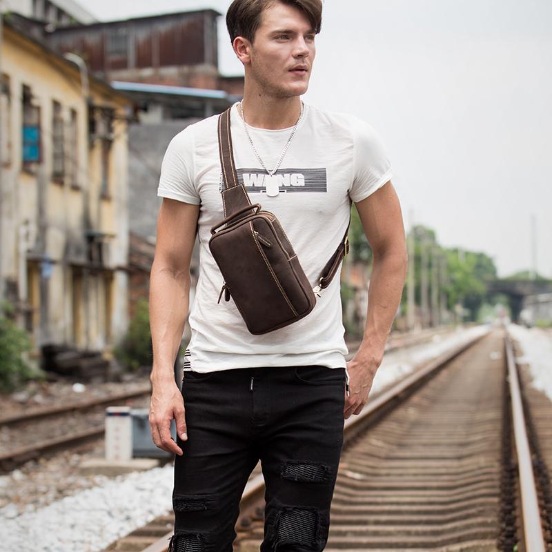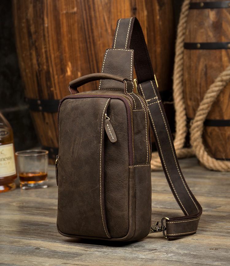 Design: Dark Brown Leather Mens 8 inches Sling Bag Sling Pack Casual Chest Bags One Shoulder Backpack for Men