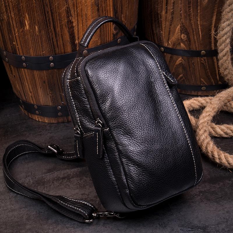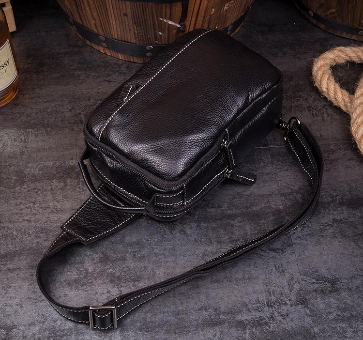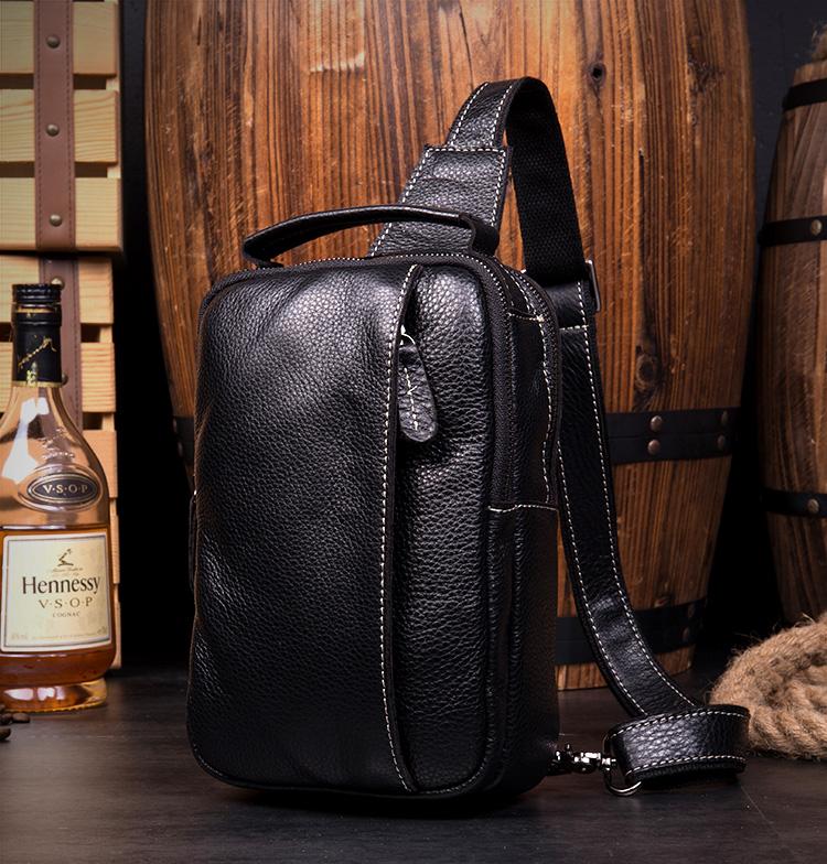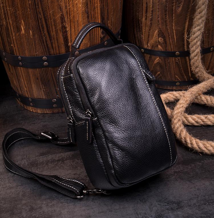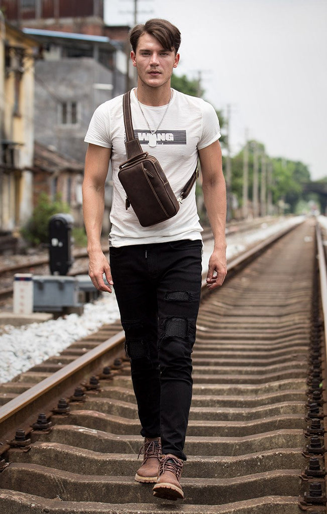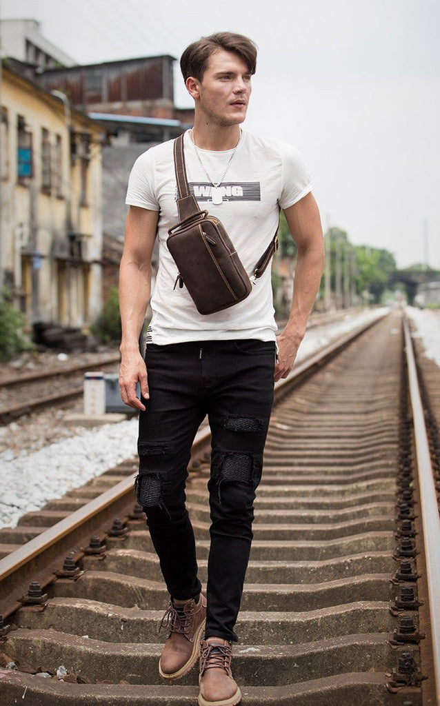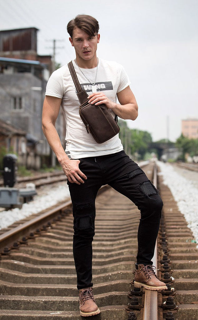Design: Dark Brown Leather Mens 8 inches Sling Bag Sling Pack Casual Chest Bags One Shoulder Backpack for Men