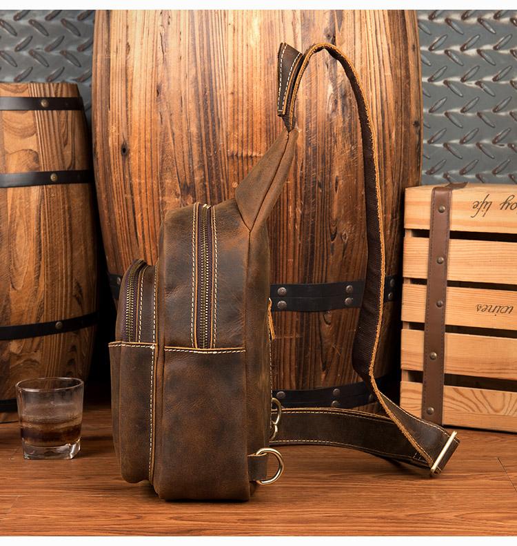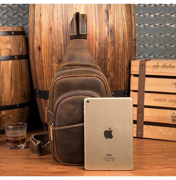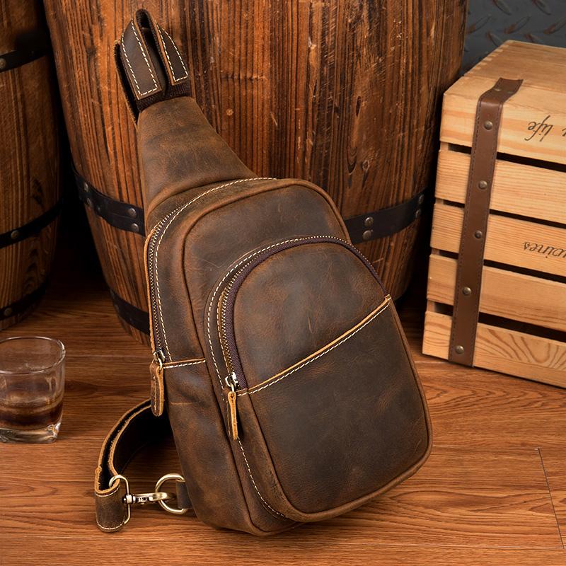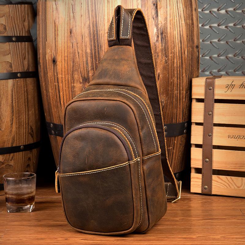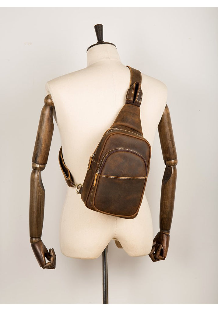 Design: Dark Brown Leather Mens Cool 8-inch Sling Bags Crossbody Bag Brown Chest Bag for men