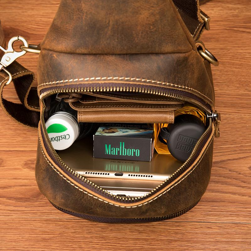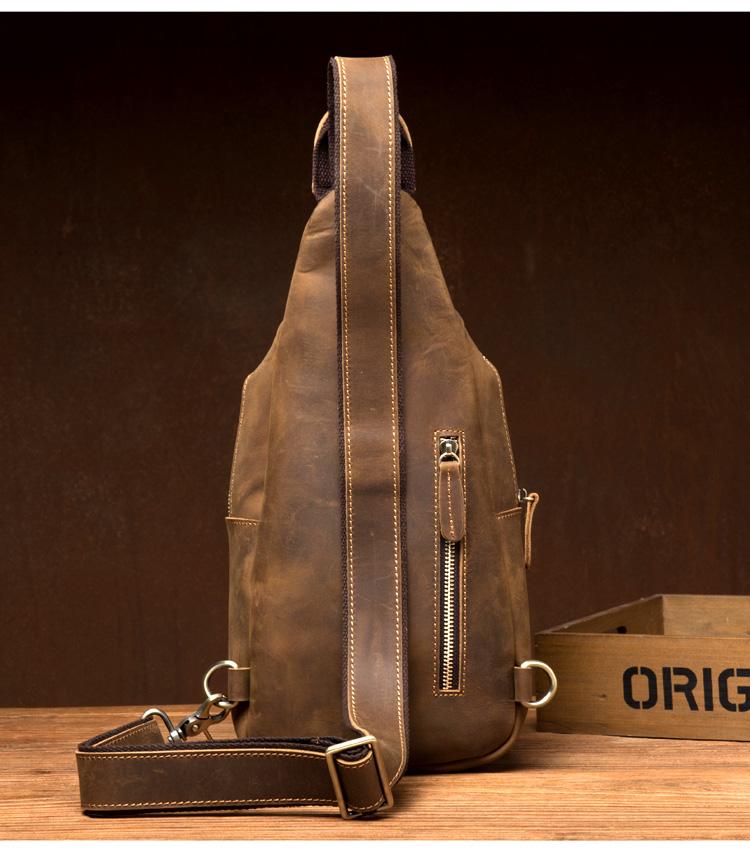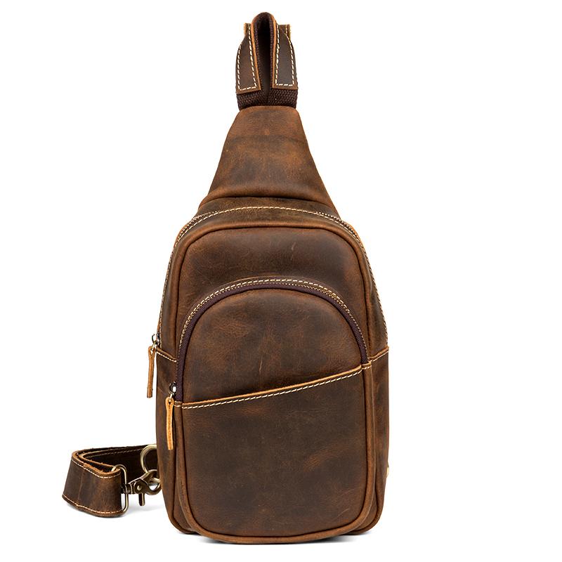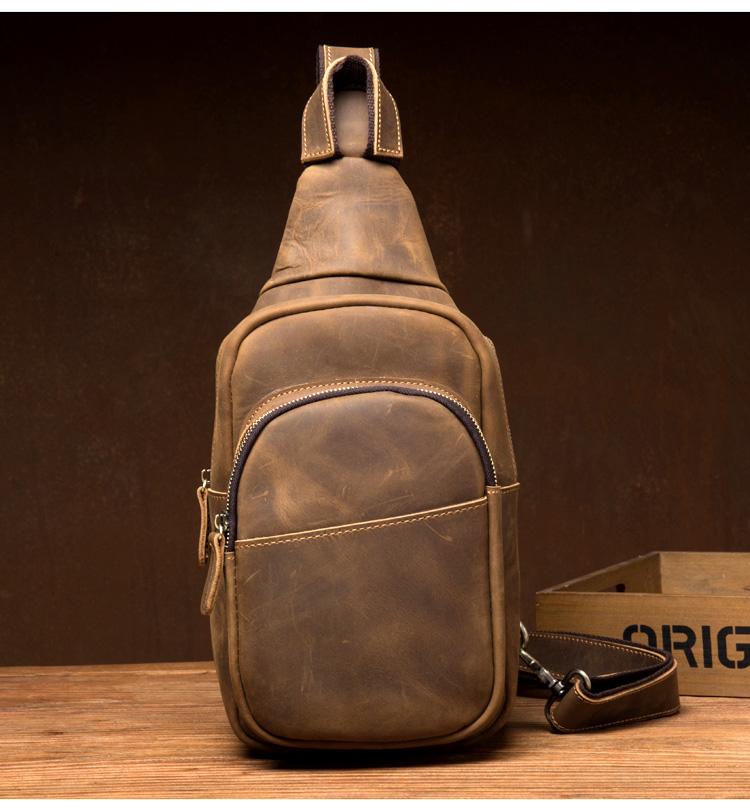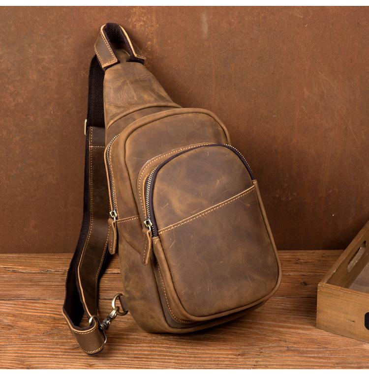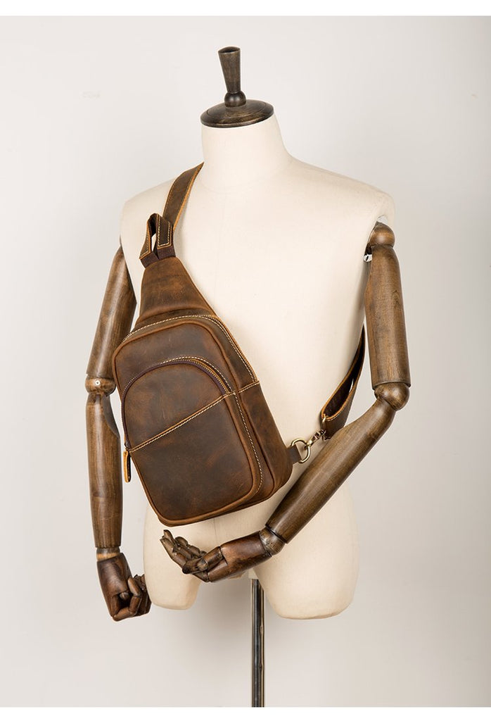 Design: Dark Brown Leather Mens Cool 8-inch Sling Bags Crossbody Bag Brown Chest Bag for men