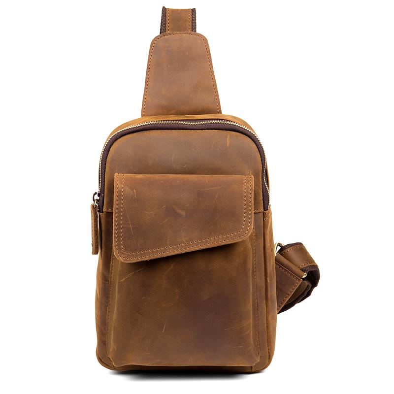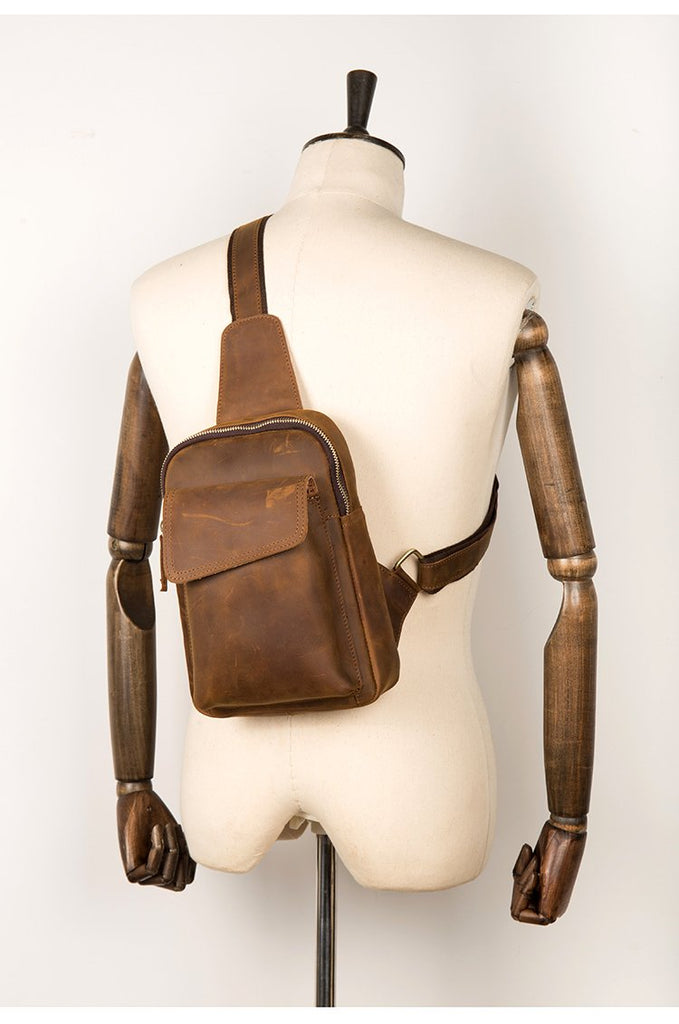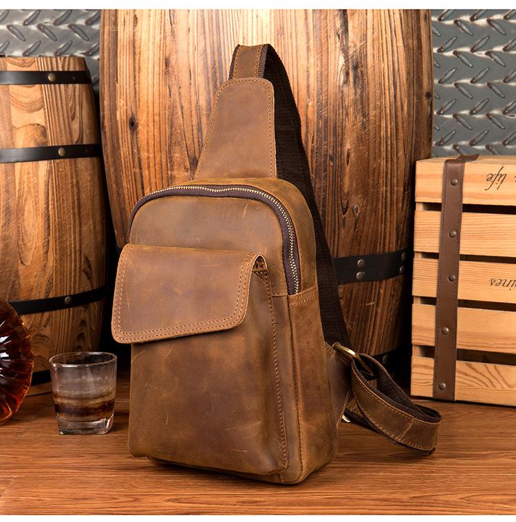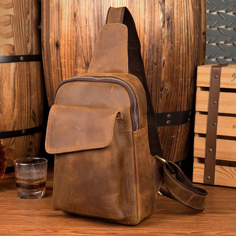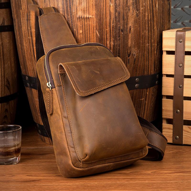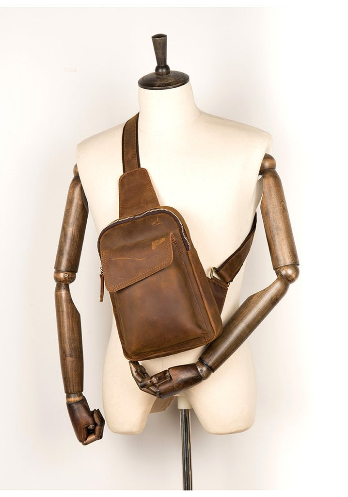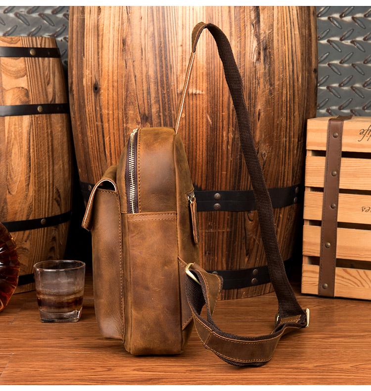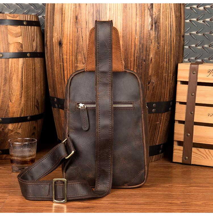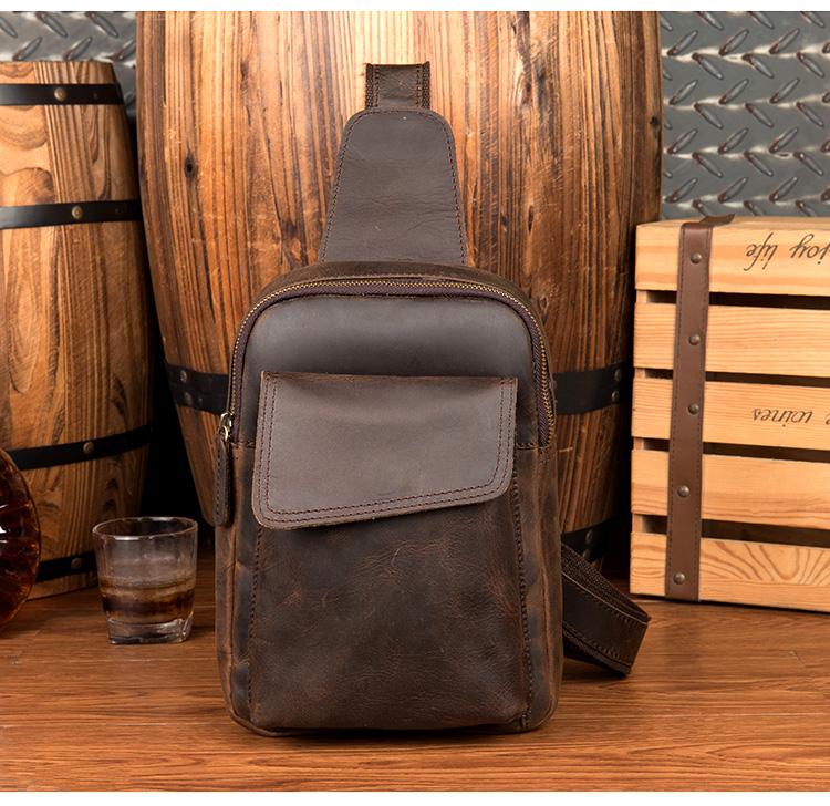 Design: Dark Brown Leather Mens Cool 8-inches Sling Bag Crossbody Bag Brown Chest Bag for men