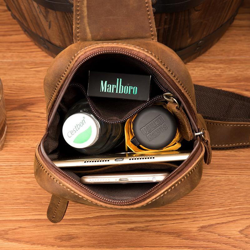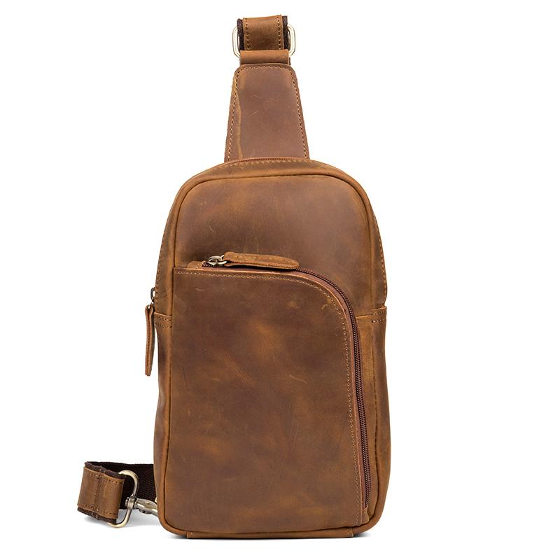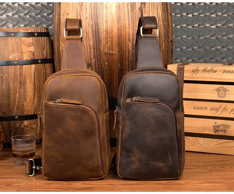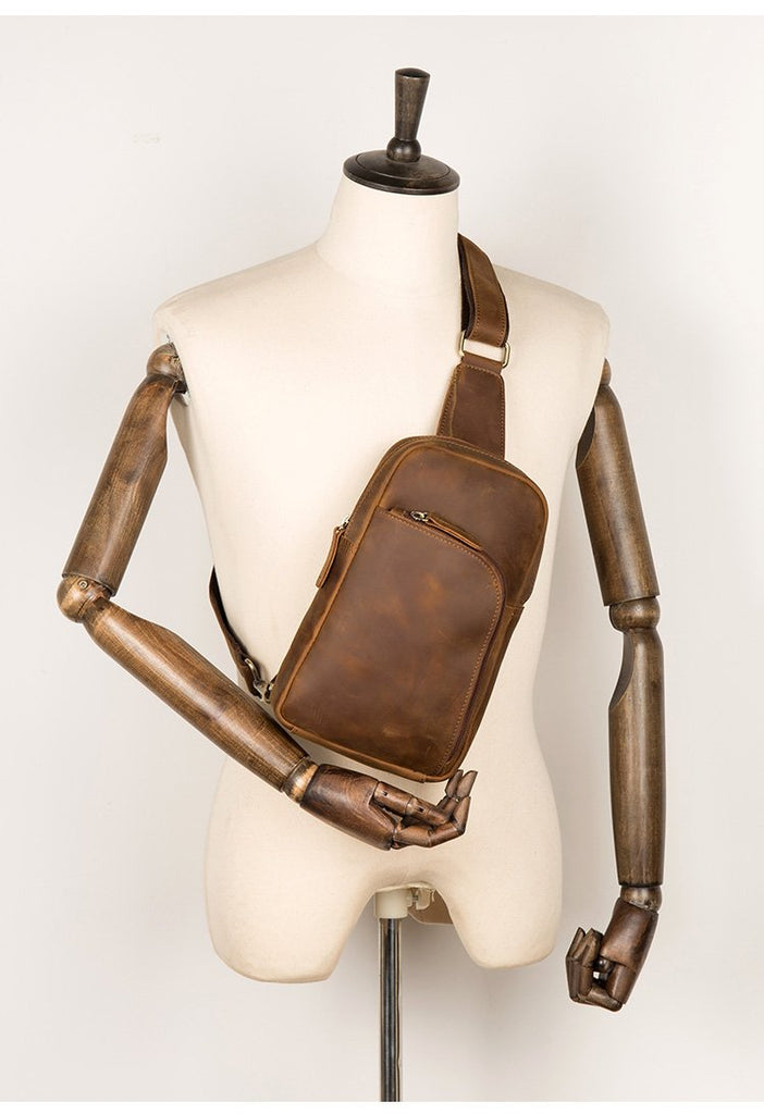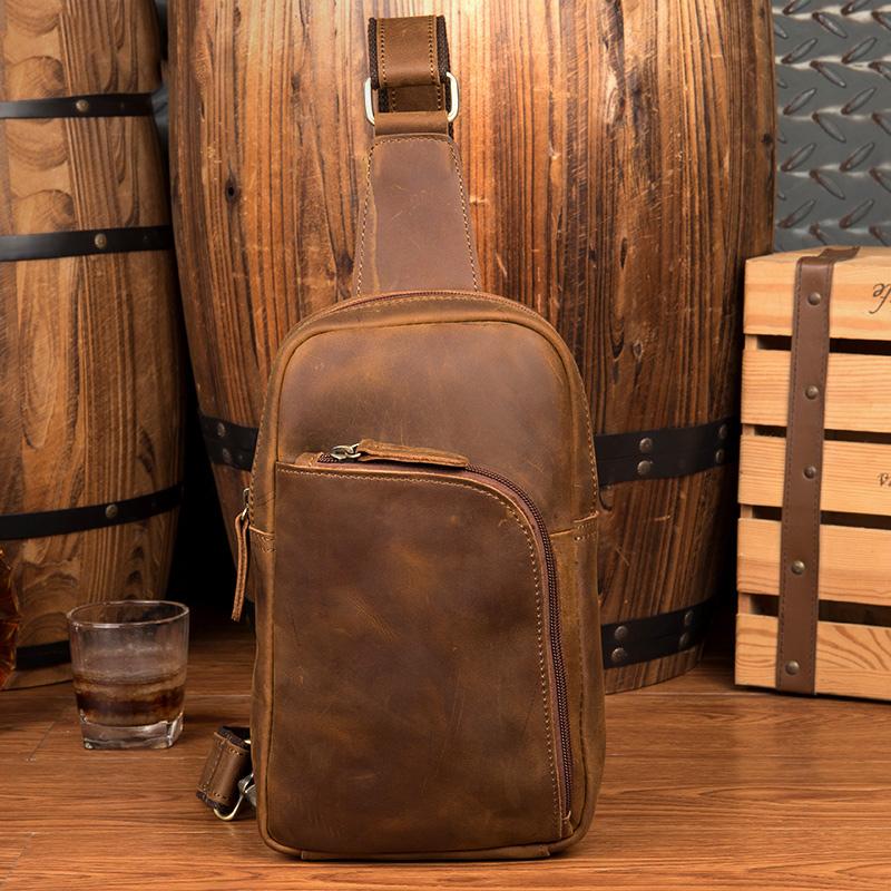 Design: Dark Brown Leather Mens Cool 8 inches Sling Bags Brown Crossbody Bag Chest Bag for men