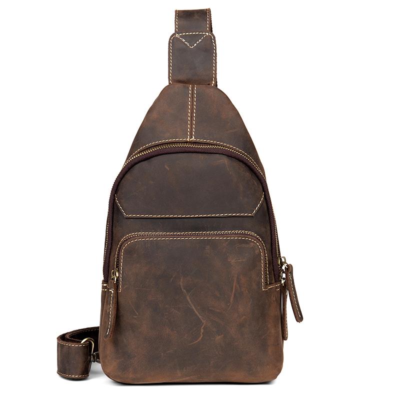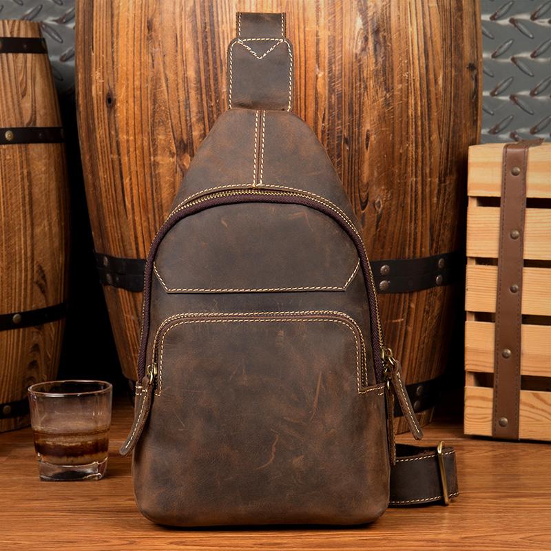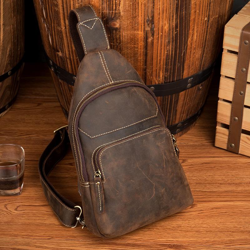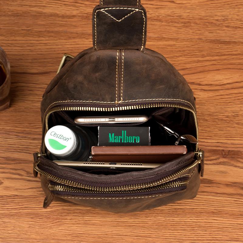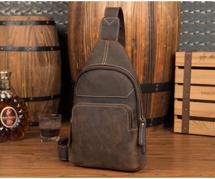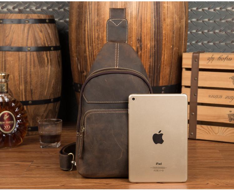 Style: Dark Brown Leather Mens Cool 8 inches Sling Bags Crossbody Bag Chest Bag for men