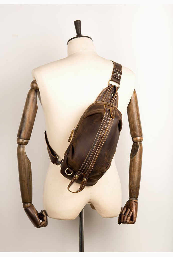 Design: Dark Brown Leather Mens Cool 8 inches Sling Bags Light Brown Crossbody Bag Chest Bag for men