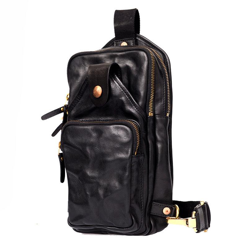 Design: Fashion Black Leather Men Light Brown Chest Bag Messenger Bag One Shoulder Backpack For Men