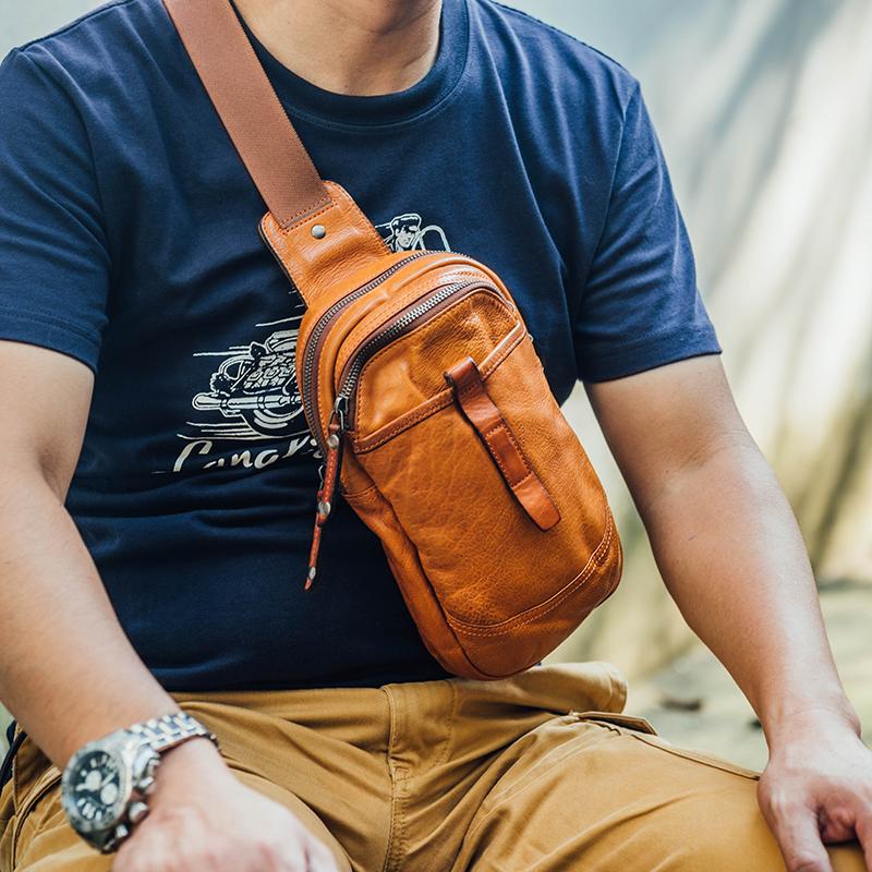 Design: Fashion Brown Leather Men Small Chest Bag Messenger Bag One Shoulder Backpack For Men