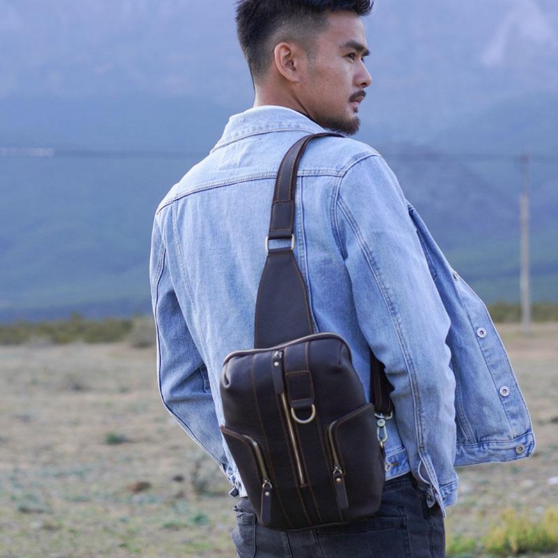 Style: Handmade Genuine Leather Coffee Mens Cool Sling Pack Bag Crossbody Bag Chest Bag for men