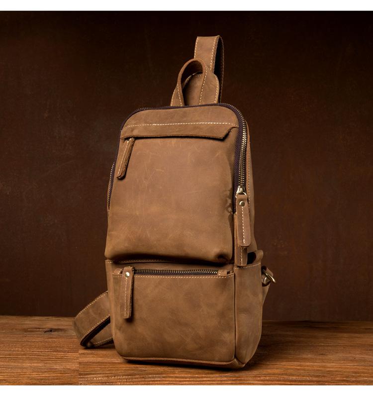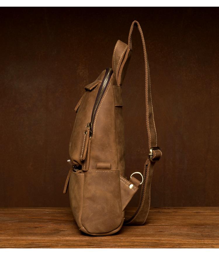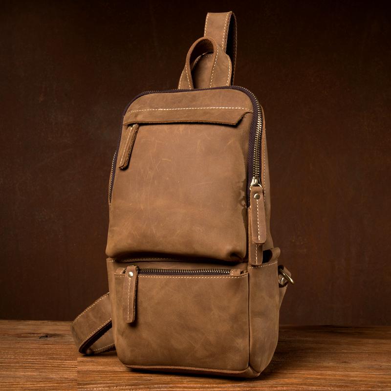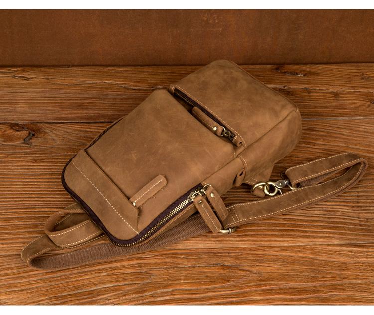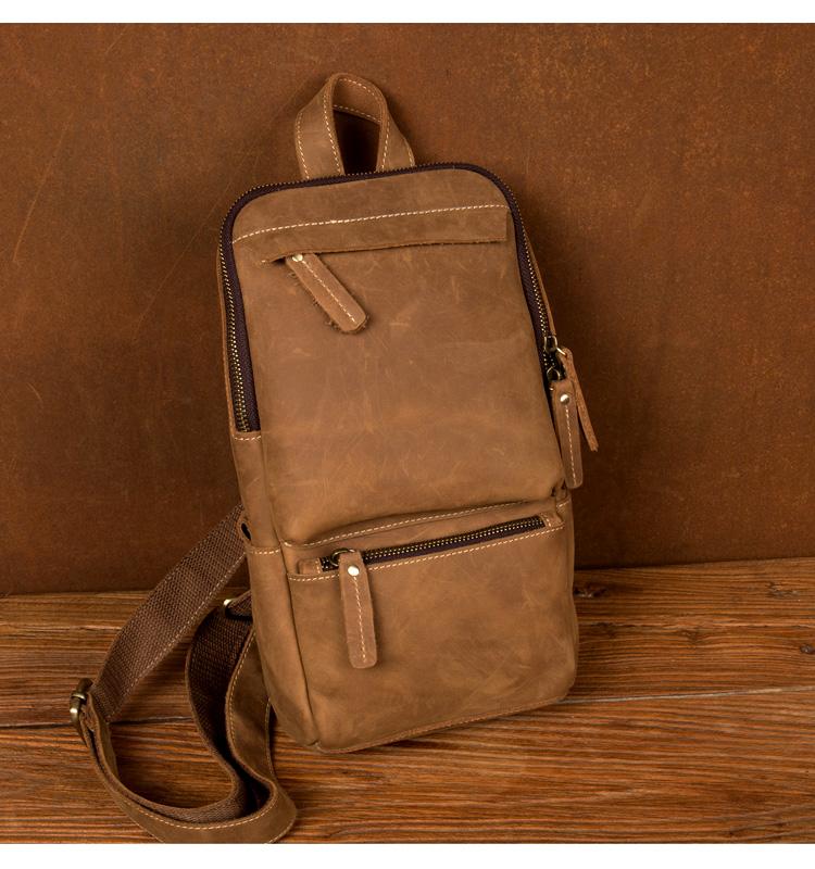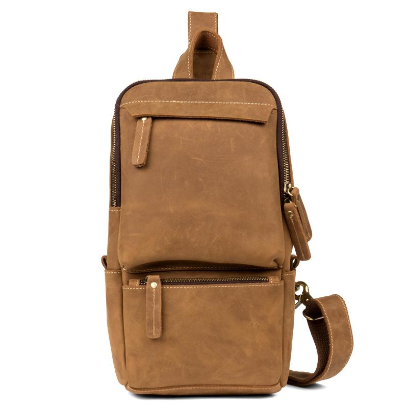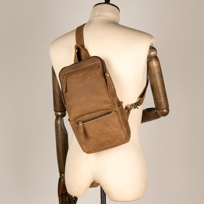 Design: Light Brown Leather Mens Cool 10 inches Sling Bag Crossbody Bag Chest Bag for men