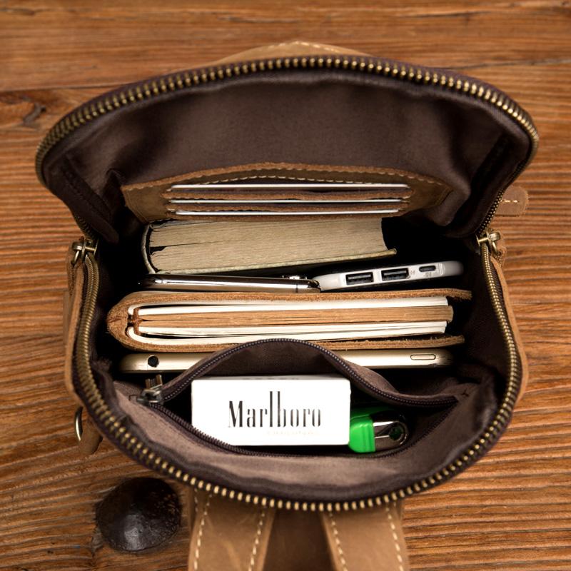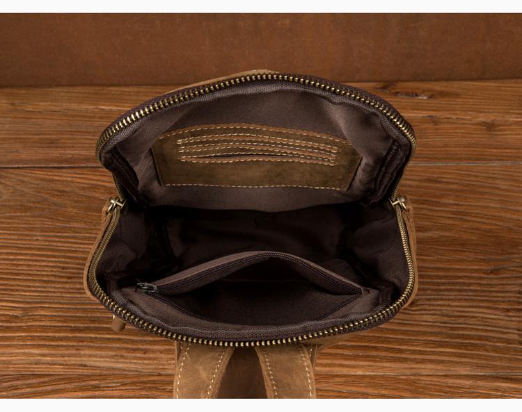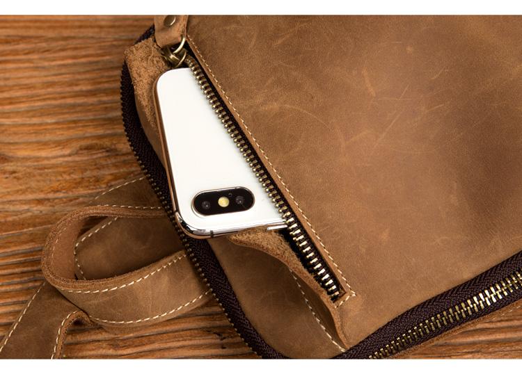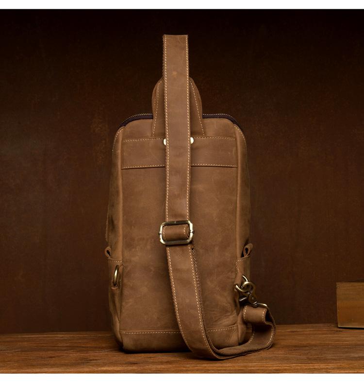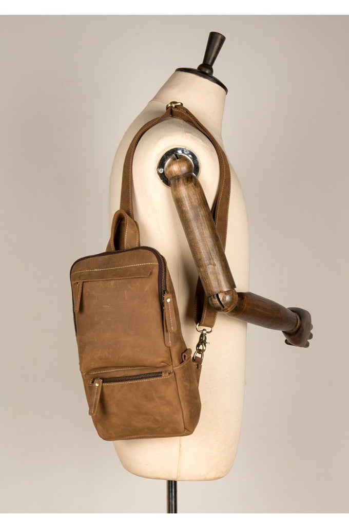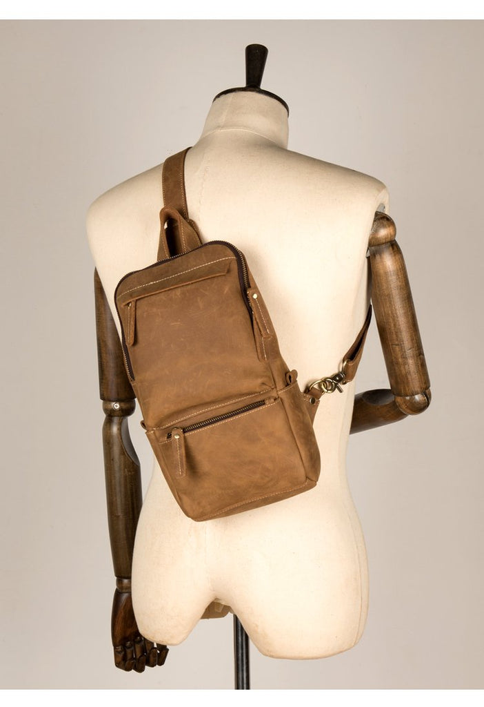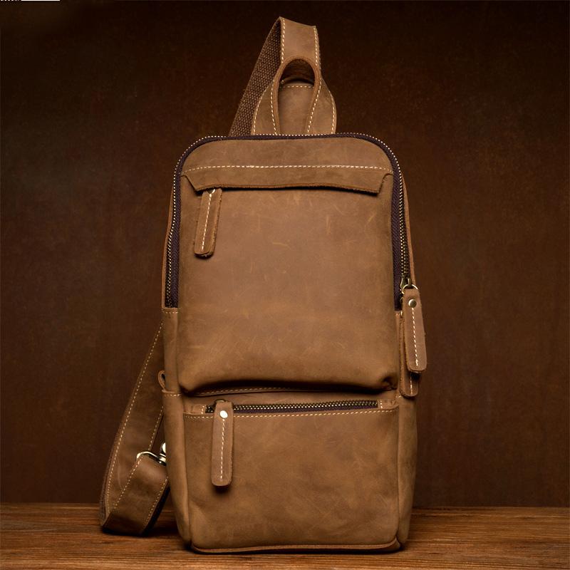 Design: Light Brown Leather Mens Cool 10 inches Sling Bag Crossbody Bag Chest Bag for men
