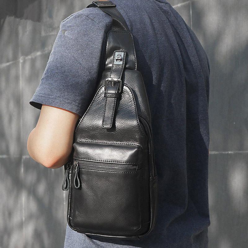 Design: Black Leather Men's Sling Bag Coffee Chest Bag One Shoulder Backpack For Men