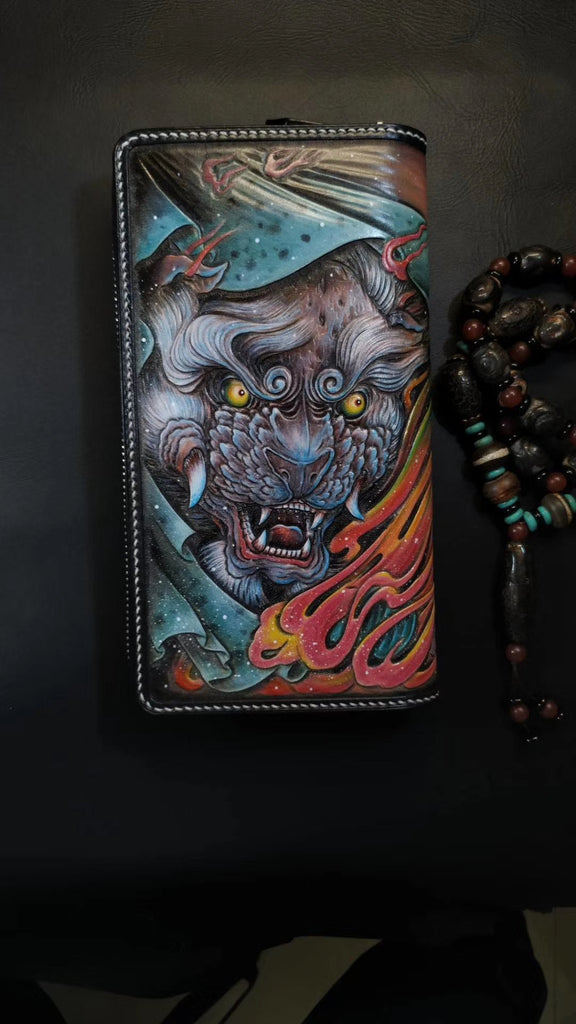 Design: Badass Black Leather Men's Dragon Head Biker Wallet Handmade Tooled Zipper Long Wallets For Men
