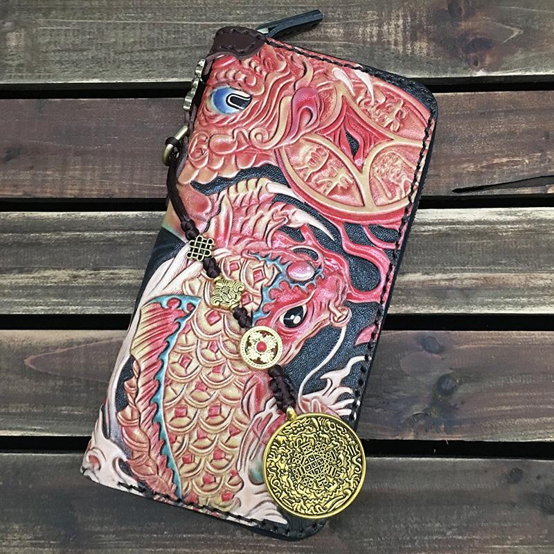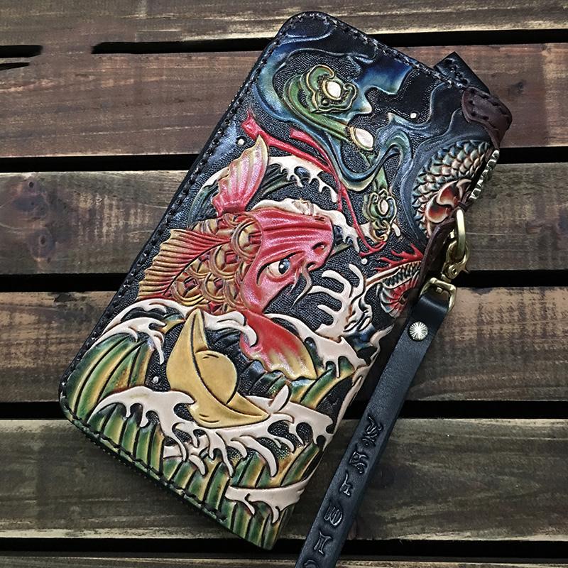 Design: Black Handmade Carp Toad Tooled Leather Long Biker Wallet Black Chain Wallet Clutch Wallet For Men