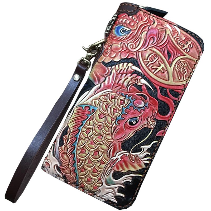 Style: Black Handmade Carp Toad Tooled Leather Long Biker Wallet Black Chain Wallet Clutch Wallet For Men