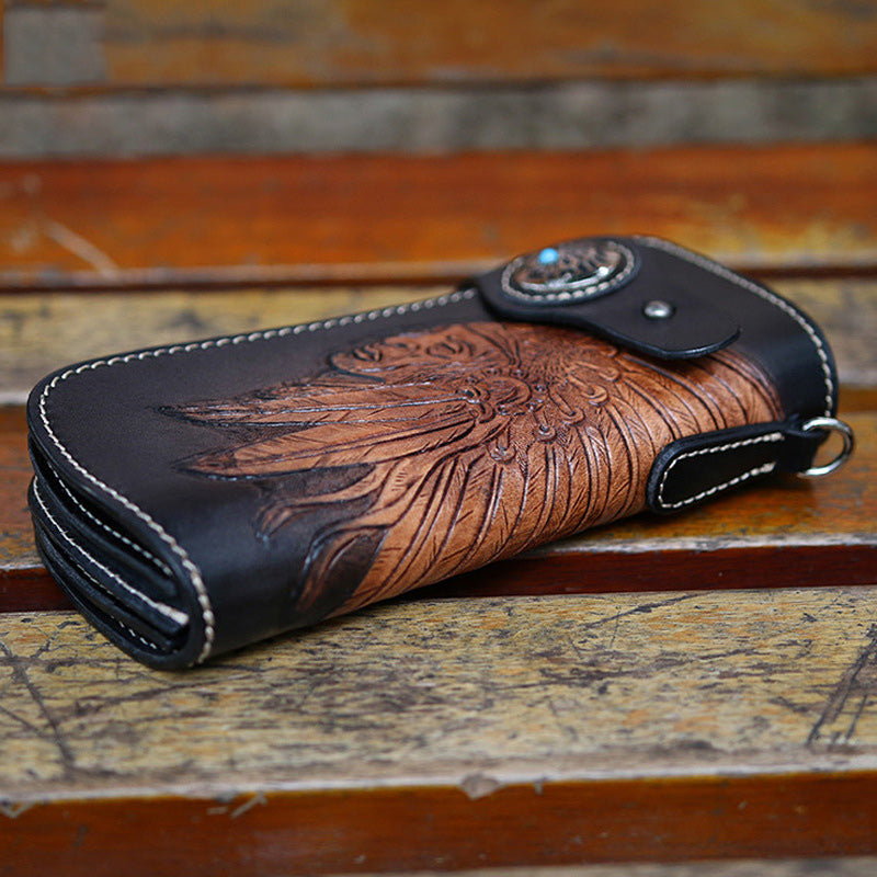 Style: Handmade Leather Tooled Indian Chief Mens Chain Biker Wallet Cool Leather Wallet Long Wallet for Men