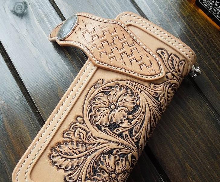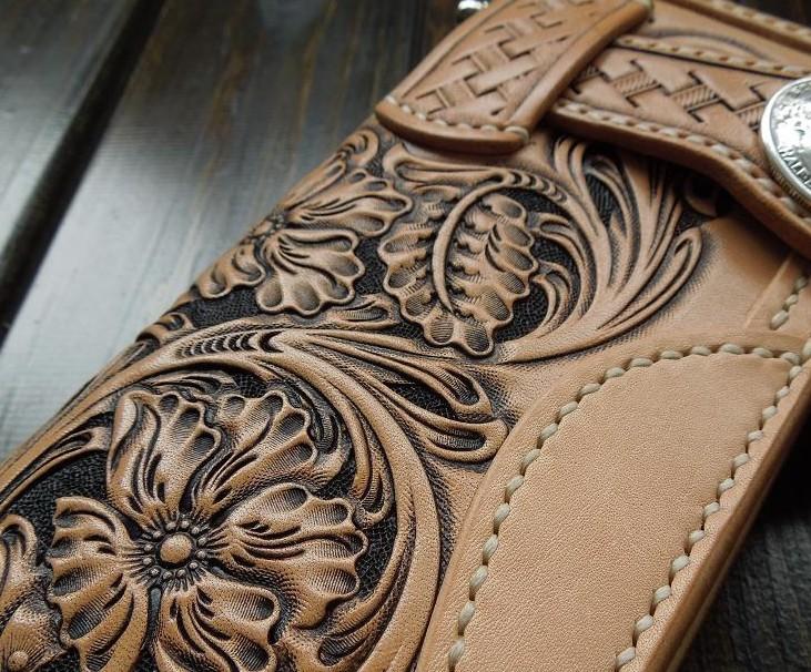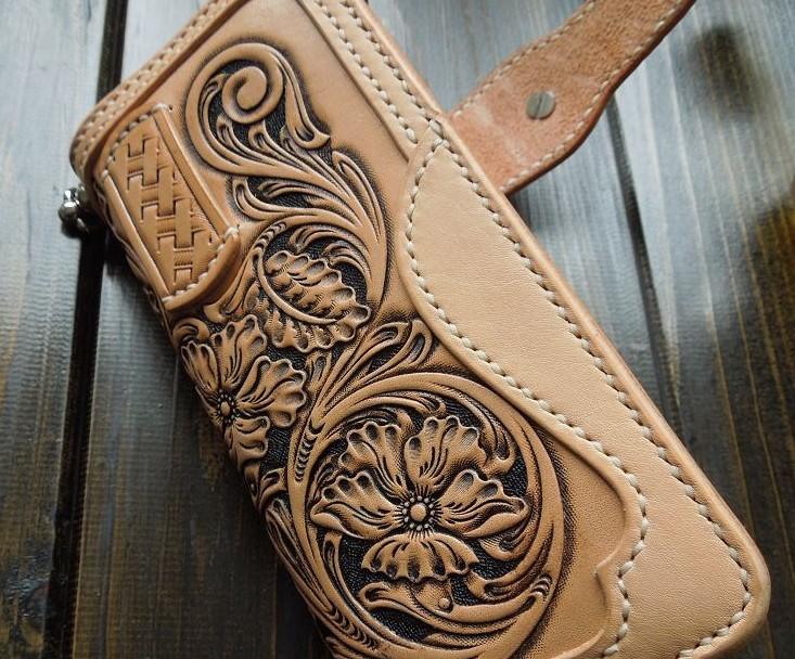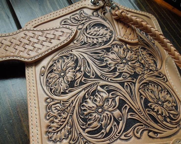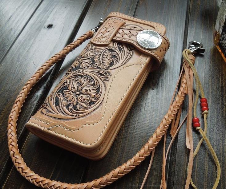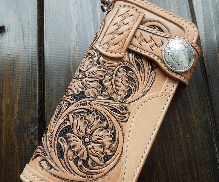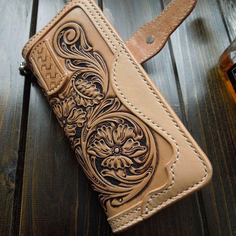 Style: Handmade Leather Biker Wallet Tooled Floral Mens Cool Chain Wallet Trucker Wallet with Chain