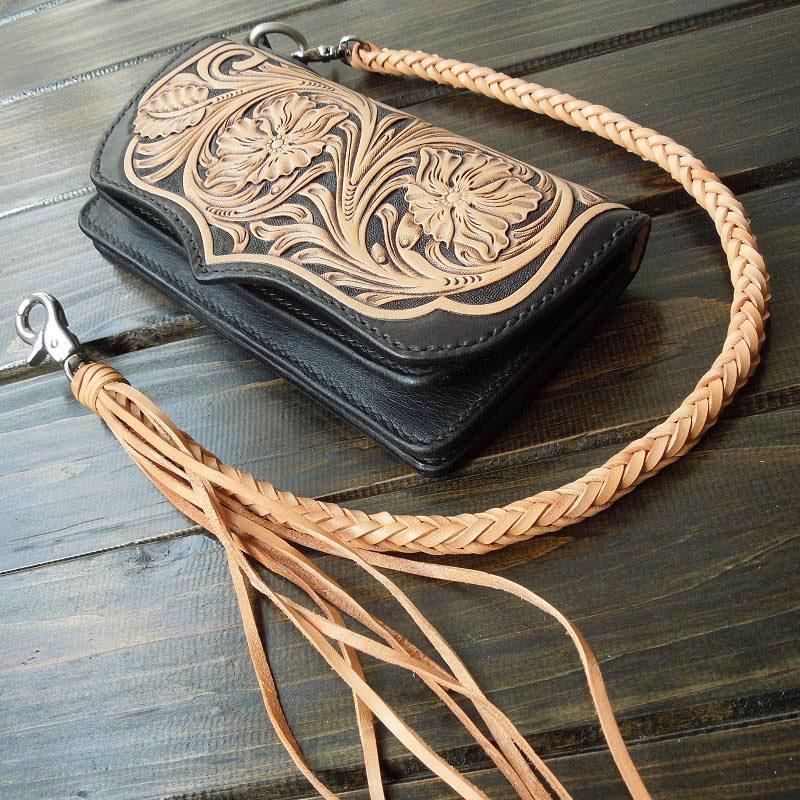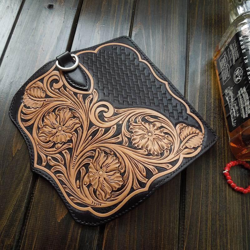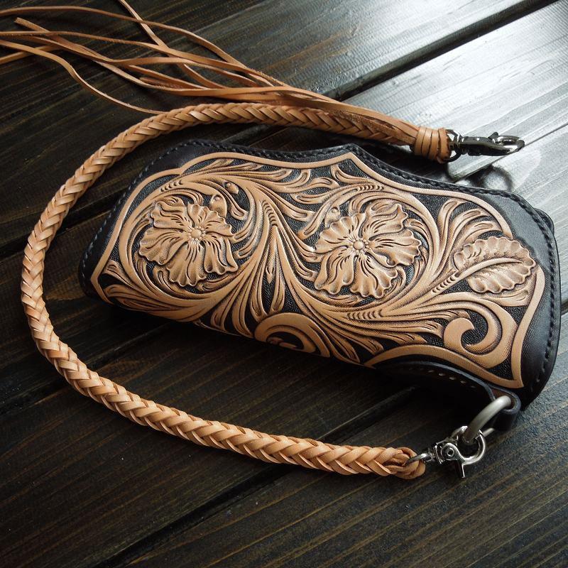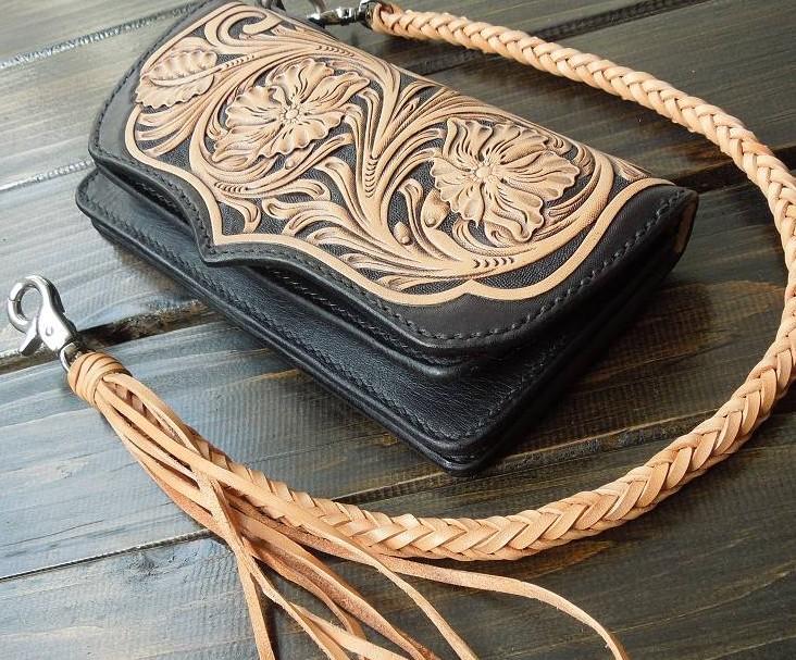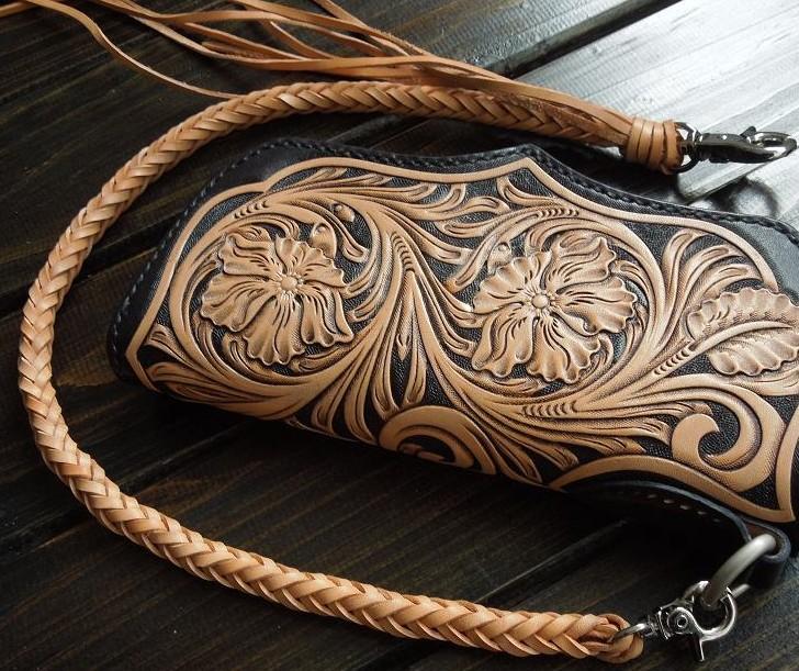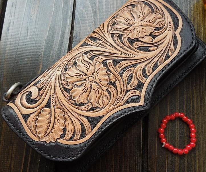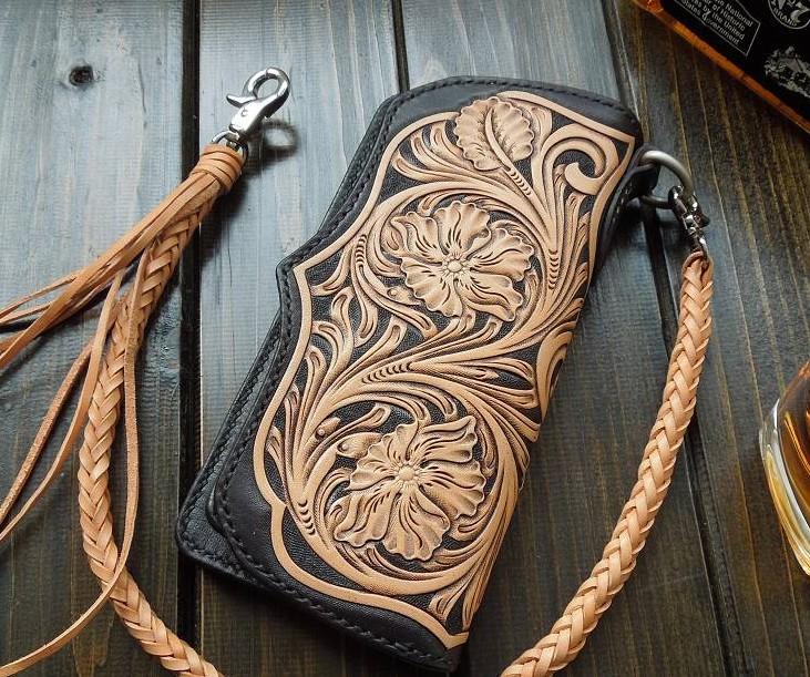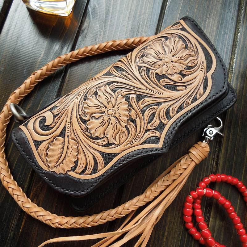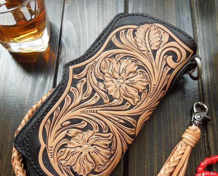 Style: Handmade Leather Biker Wallet Tooled Floral Mens Cool Chain Wallet Trucker Wallet with Chain
