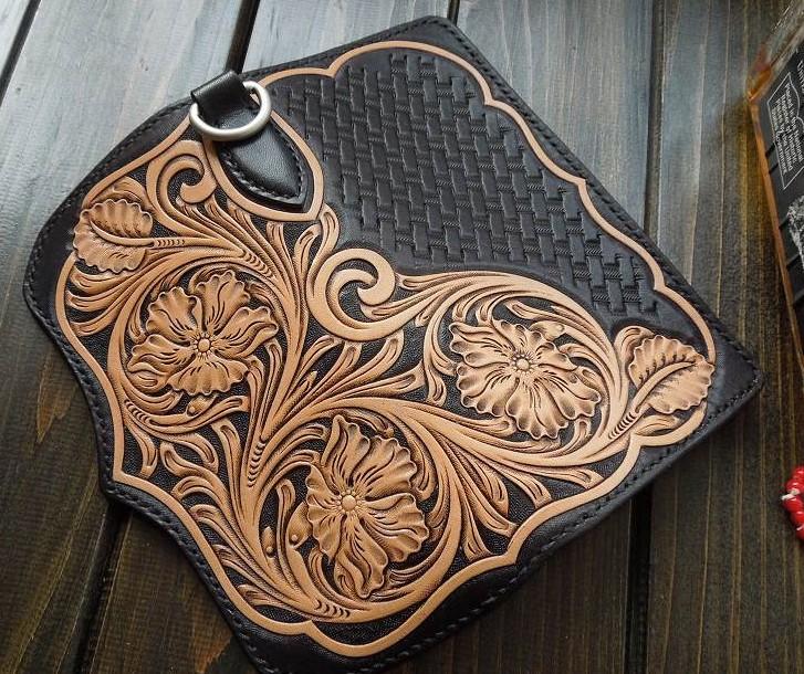 Design: Handmade Leather Biker Wallet Tooled Floral Mens Cool Chain Wallet Trucker Wallet with Chain