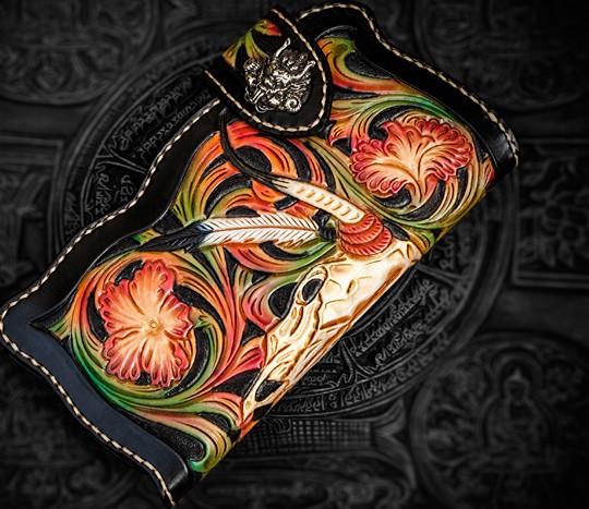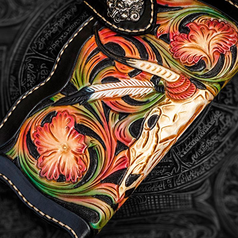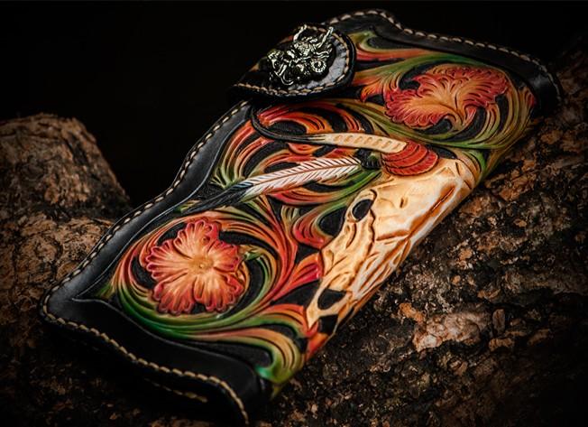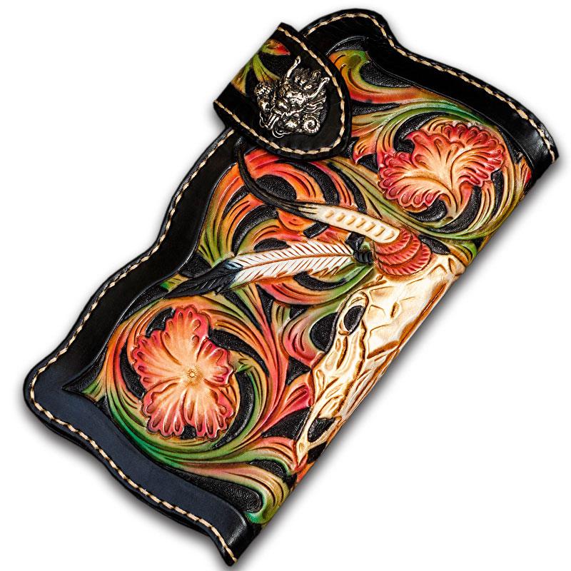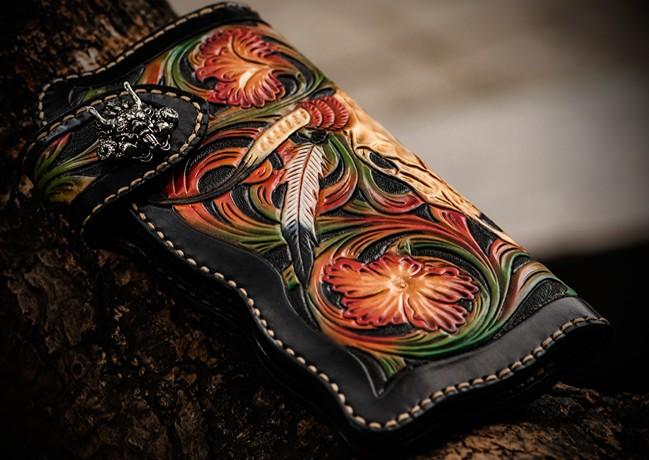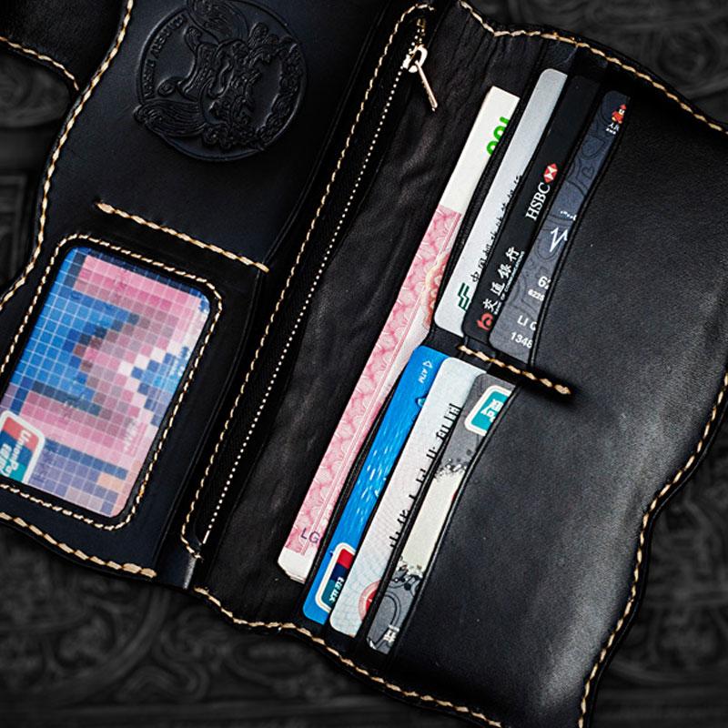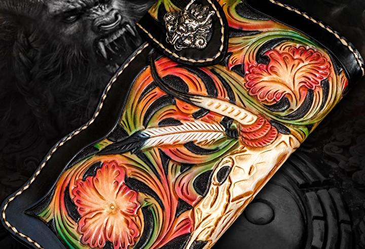 Design: Handmade Leather Black Mens Tooled Skull Chain Biker Wallet Cool Leather Wallet Long Clutch Wallets for Men