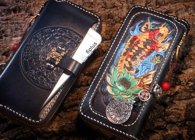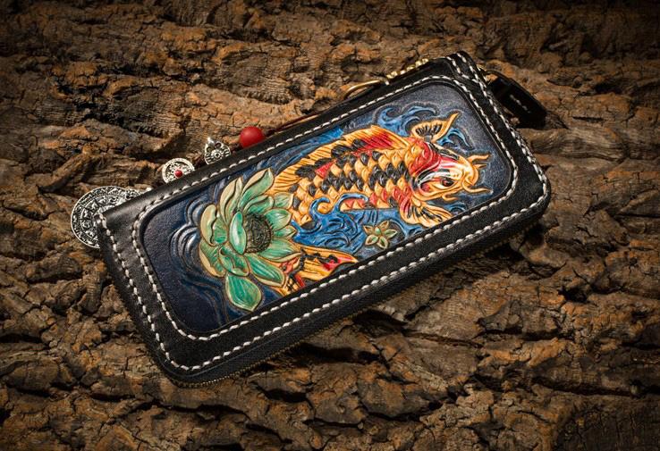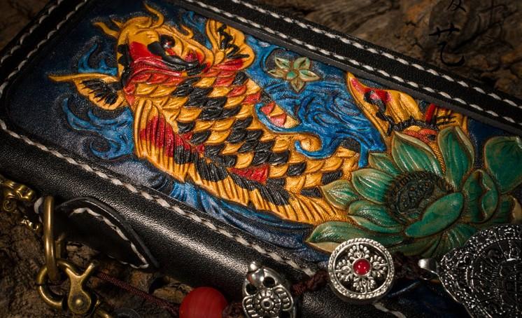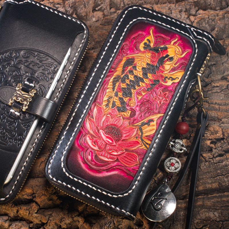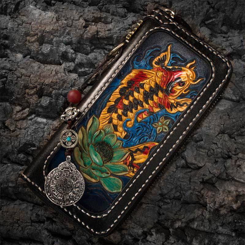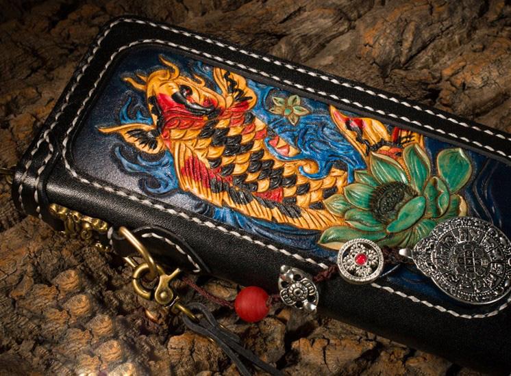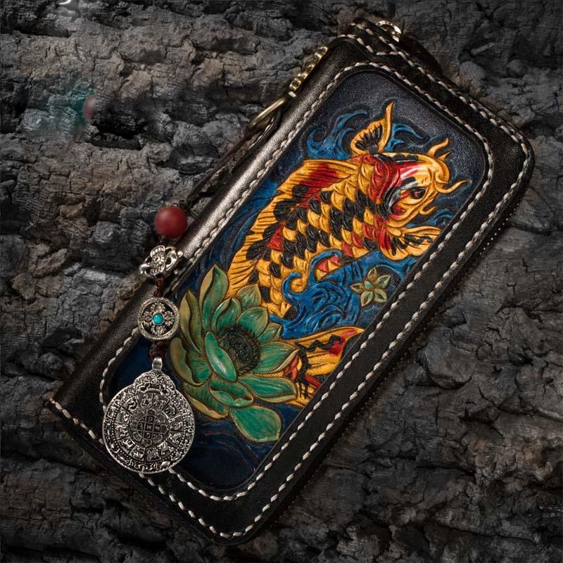 Design: Handmade Leather Carp Mens Chain Biker Wallet Cool Leather Wallet Long Phone Wallets for Men