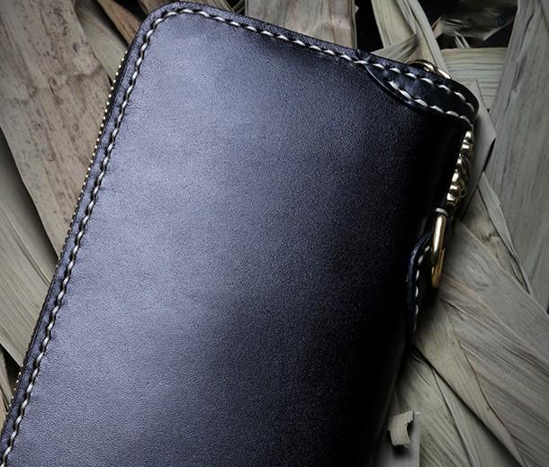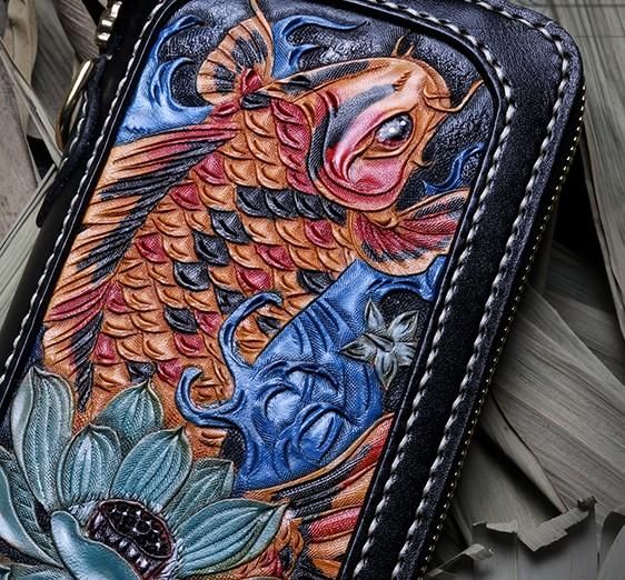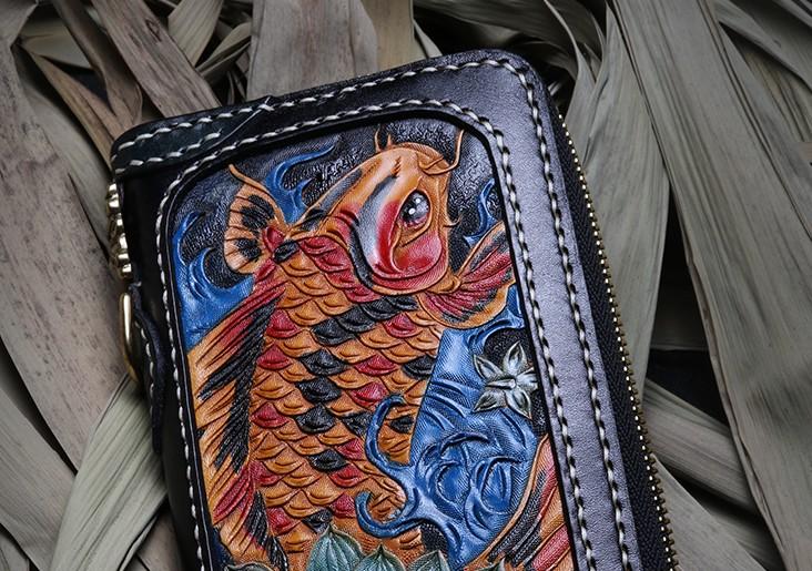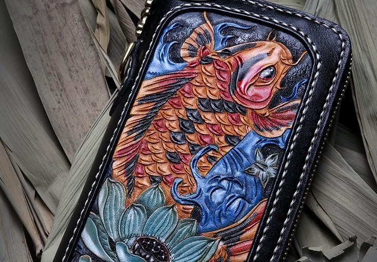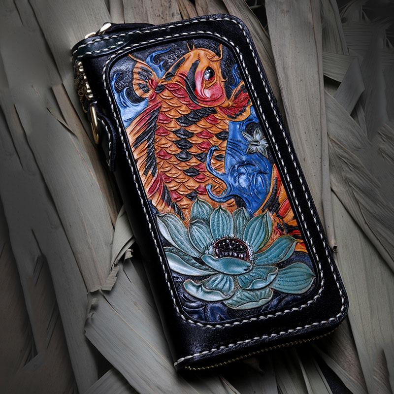 Design: Handmade Leather Carp Mens Chain Biker Wallet Cool Leather Wallet Long Phone Wallets for Men
