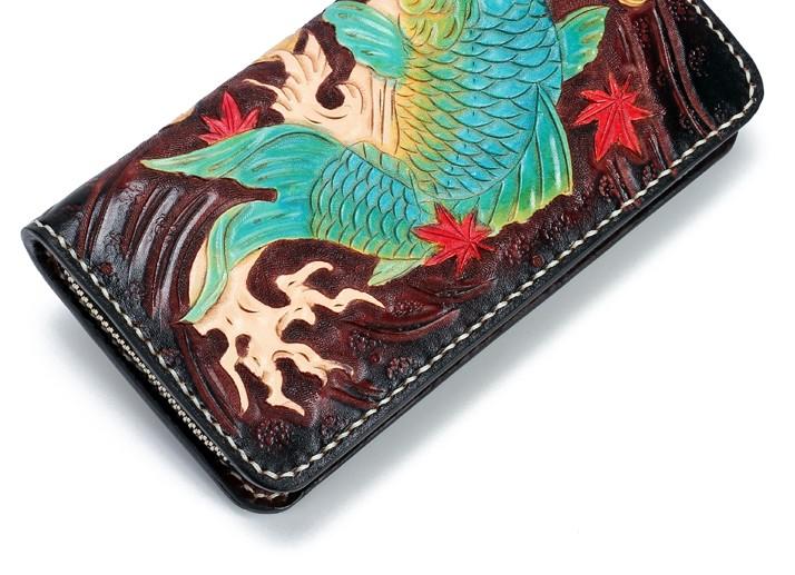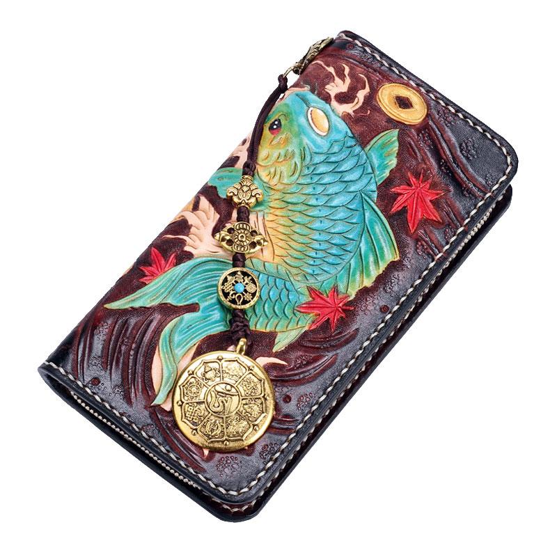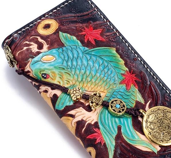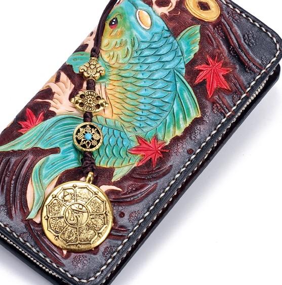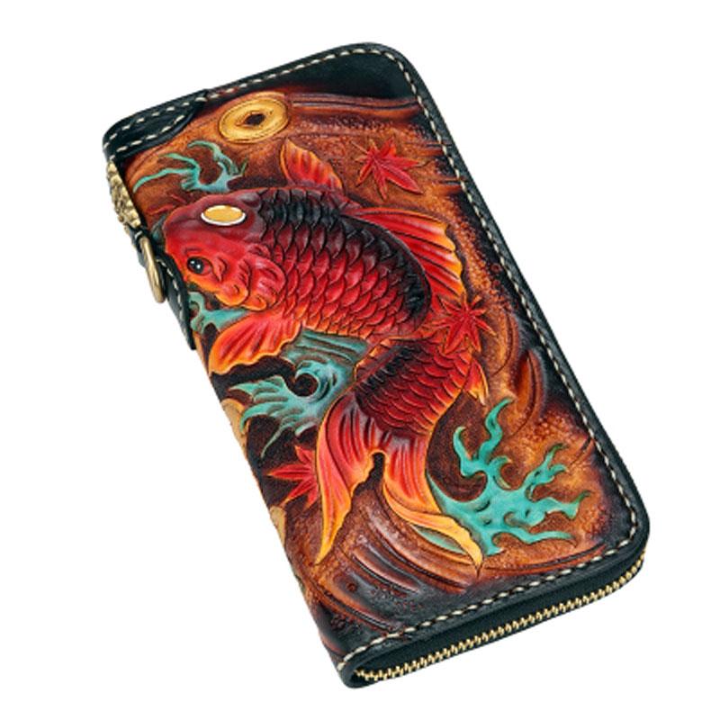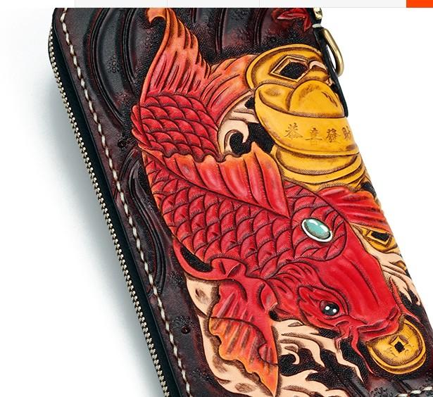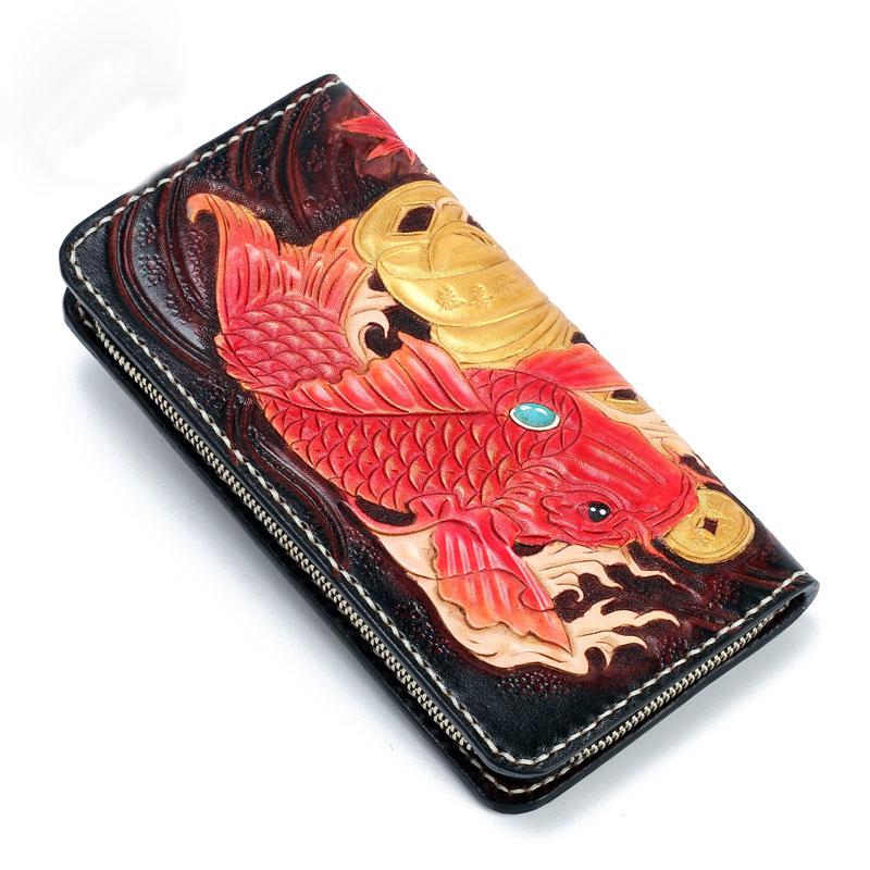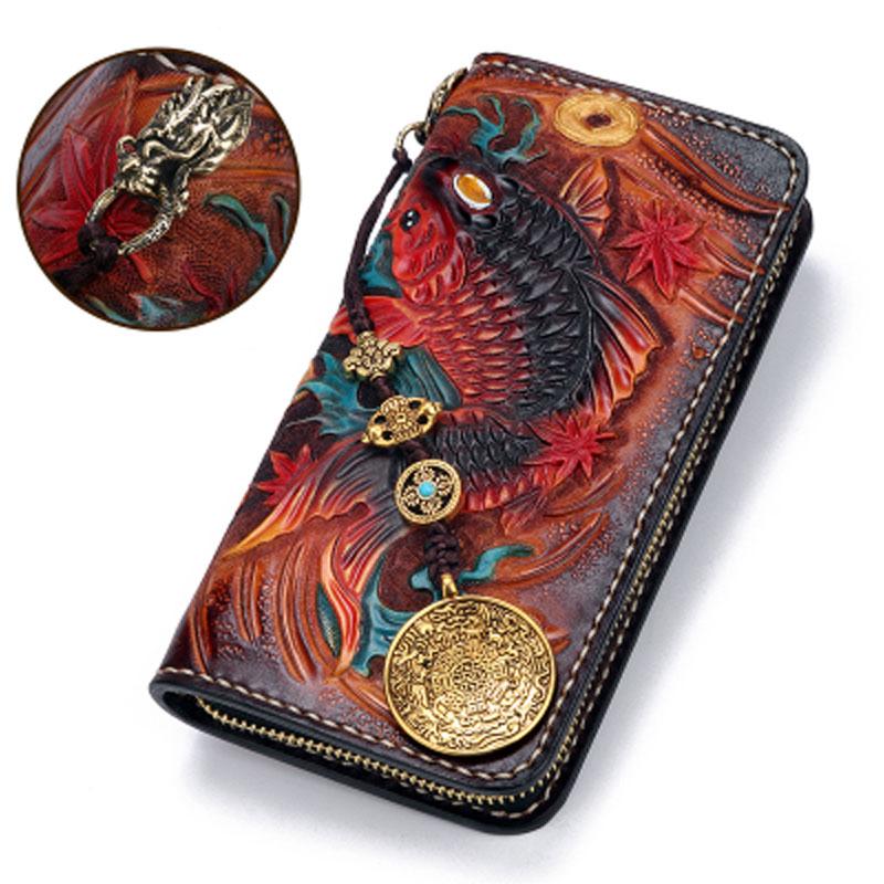Design: Handmade Leather Carp Mens Chain Biker Wallet Cool Leather Wallet Long Phone Wallets for Men