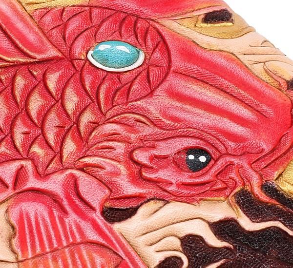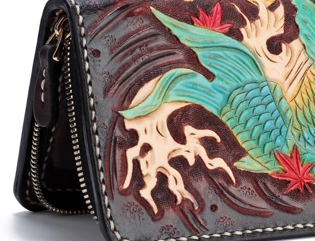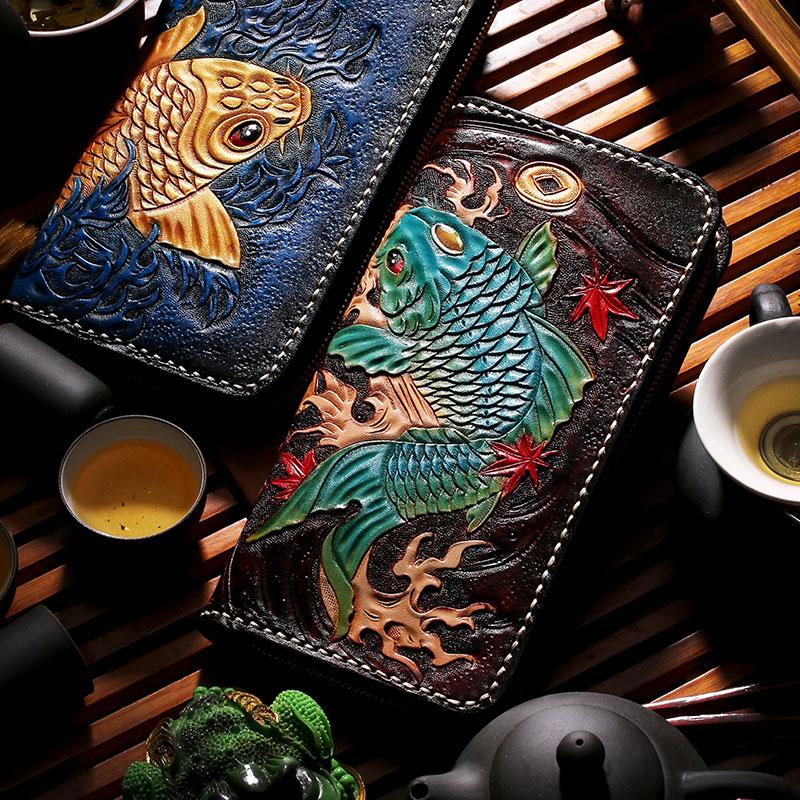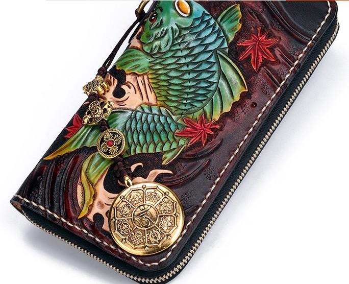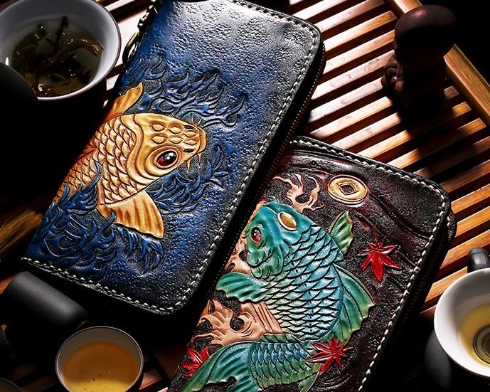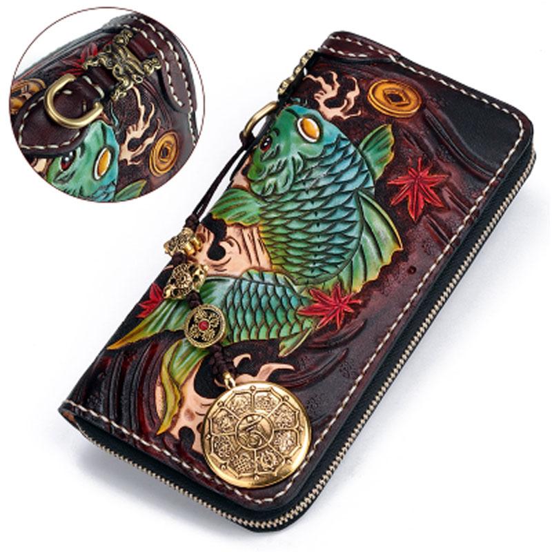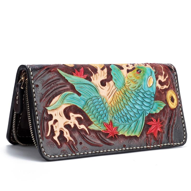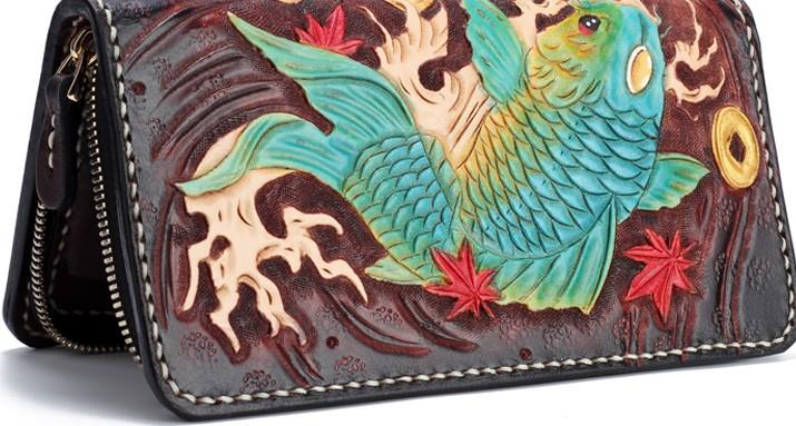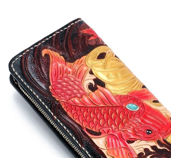 Design: Handmade Leather Carp Mens Chain Biker Wallet Cool Leather Wallet Long Phone Wallets for Men