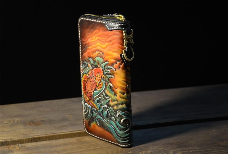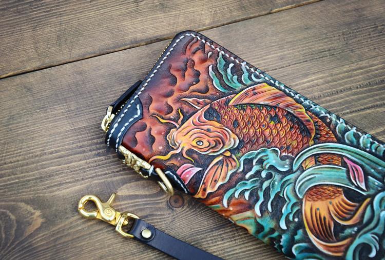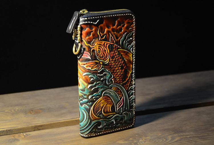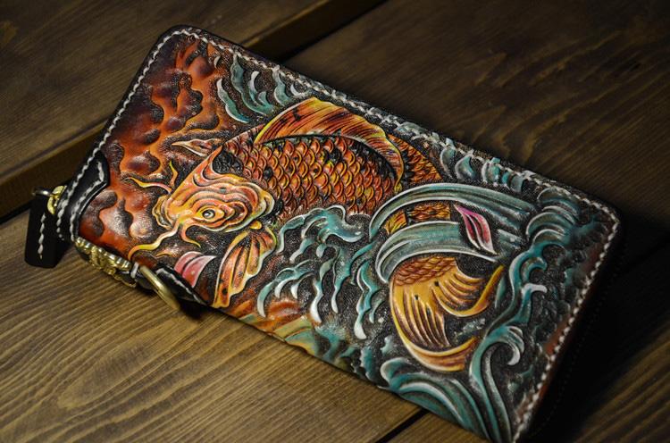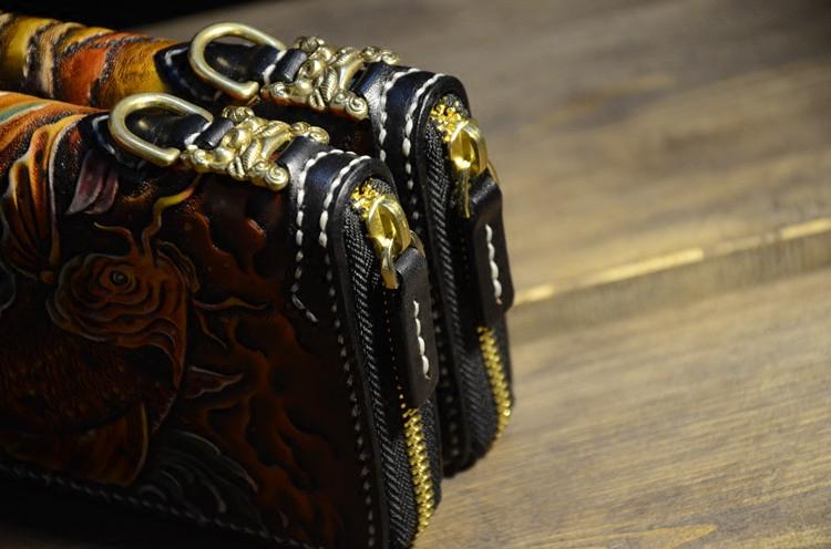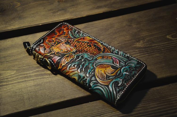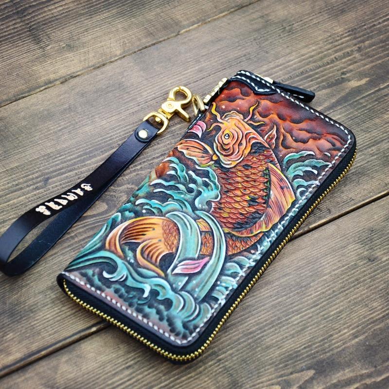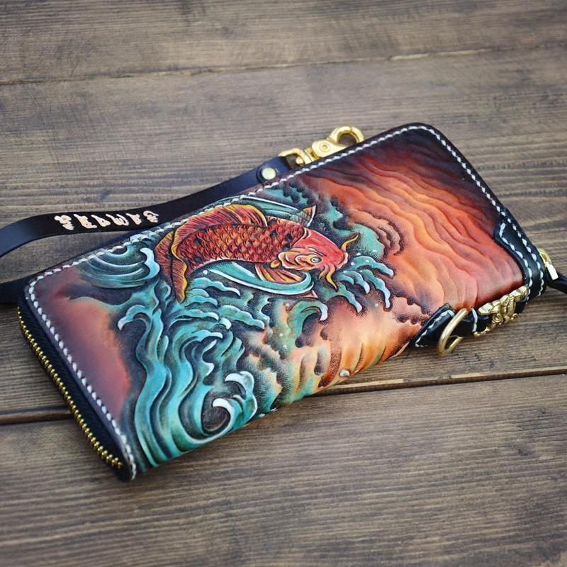 Design: Handmade Leather Carp Mens Chain Biker Wallet Cool Leather Wallet Long Phone Wallets for Men