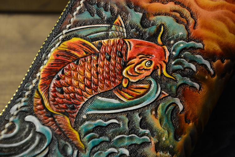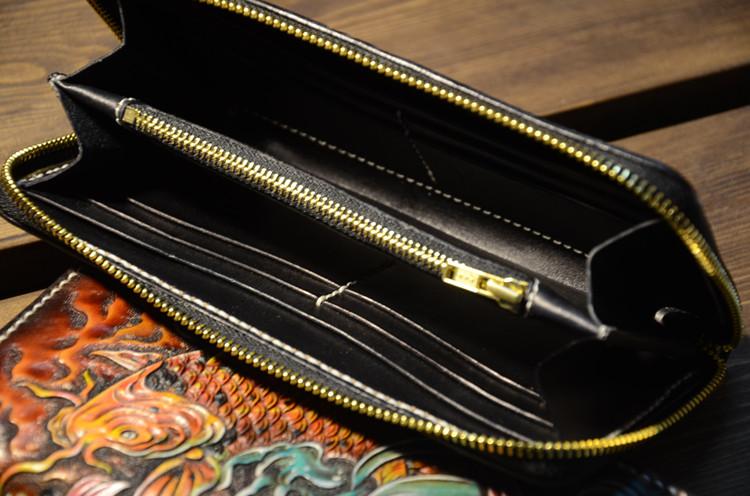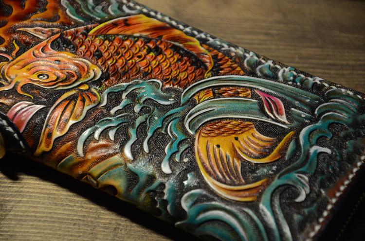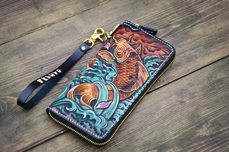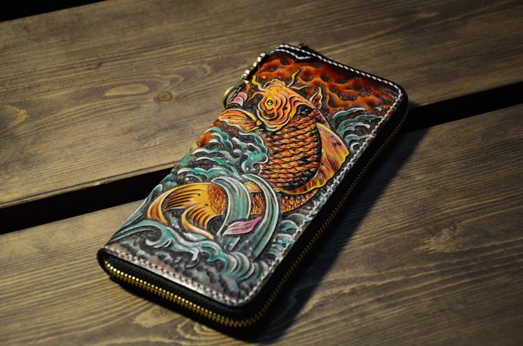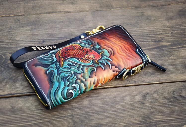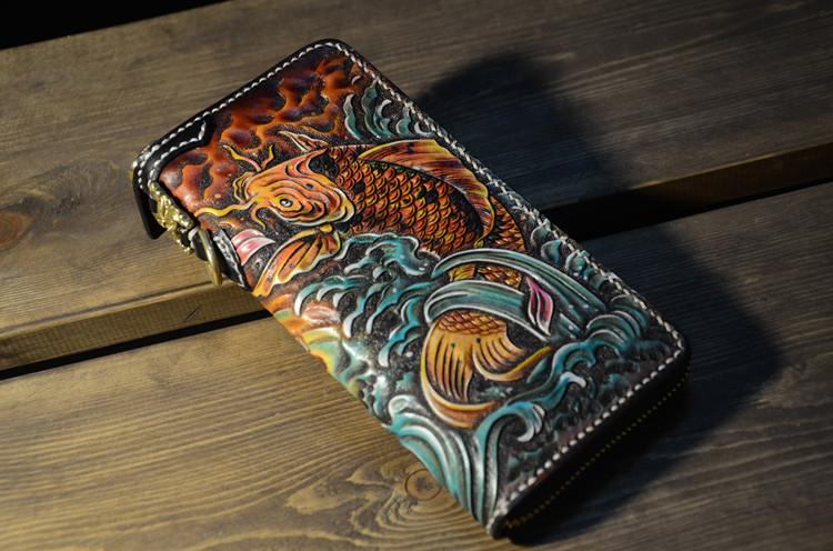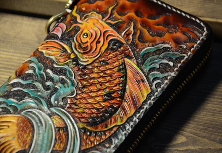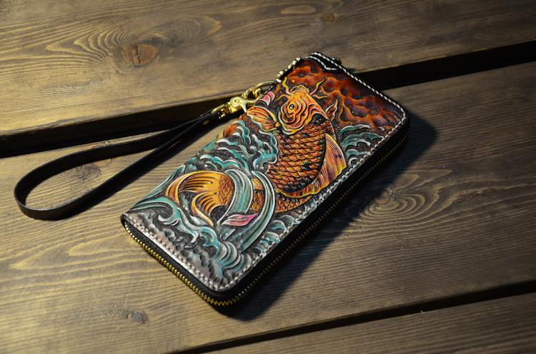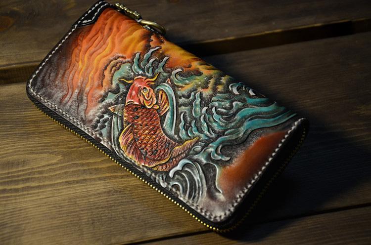 Design: Handmade Leather Carp Mens Chain Biker Wallet Cool Leather Wallet Long Phone Wallets for Men