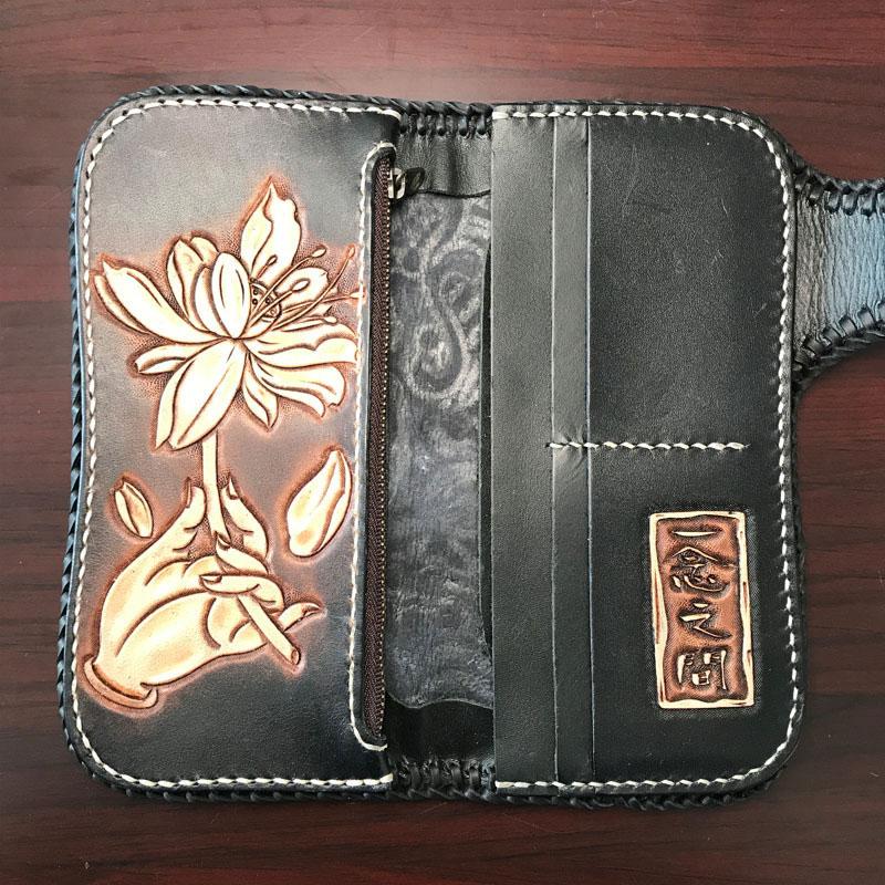 Design: Handmade Leather Mens Cool Black Buddha Chain Wallet Biker Trucker Wallet with Chain